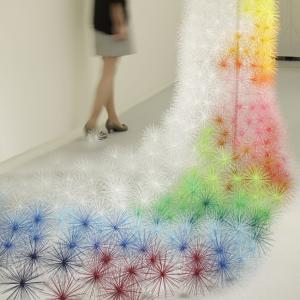 Toge (Japanese for thorn) is a modular product. Each "thorn" gives the viewer the impression of a sharp and stiff object, but these modules can in fact be freely combined to create a soft, pliable and standalone space. At DESIGNTIDE TOKYO 2011, Emmanuelle arranged five hundred of these Toge modules in 15 different colors to form a wedding dress. This conceptual piece was an exercise in contradictory impressions and sensations - solid and stiff but soft and pliable, menacing yet gentle.