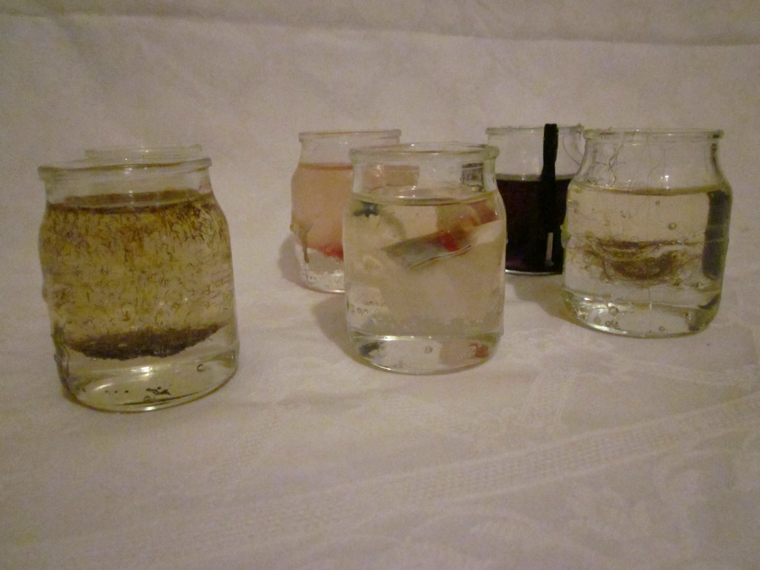 The idea was that of a still life, one or more objects suspended in a transparent medium. At the end, instead of a single container, we chose 6 glass yogurt jars filled with transparent gel for candles. Within each pot is inserted something: hair, beard hair, fingernails, chewing gum, the label of a shirt, a shoe lace.