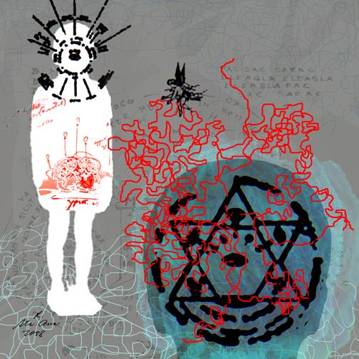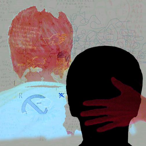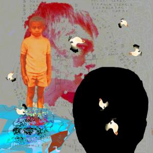 Mixed media on paper, with the image of feet embellished with acrylic paint, resin and pulverized pastel stick.