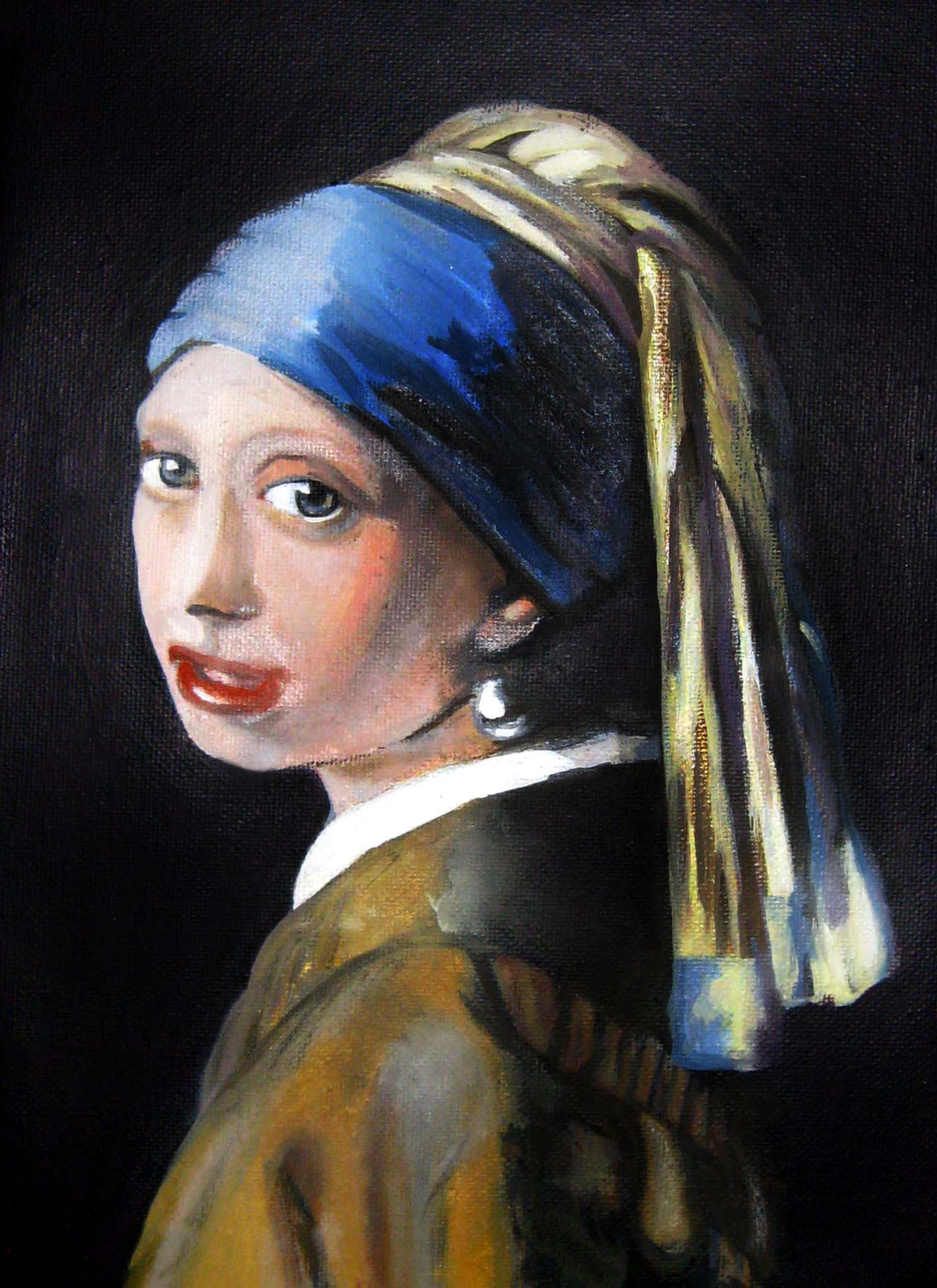 Girl with a Pearl Earring Painting, Portrait, Oil, 22.5x30cm Canvas Oil A tribute to Johannes Vermeer-Girl with a Pearl Earring. Added 13 years ago 7 I Like I don't like 25 Comments 185 Visits Share Facebook Twitter Google + Has been liked by 7 giacinto Artist - Firenze, Italy Tamara Ramos Artist - New York City, United States Melvin Harris Artist - Burlington, United States Anastasia Rapantzikou Artist - Athens, Greece Gianpaolo Marchesi Artist - Reggio nell'Emilia, Italy Elia Funiati Artist - Lecce, Italy salvo anzalone Artist - Palermo, Italy Say something Comments 25 13 years ago Angela Loennig Artist Grazie, Stefania!!! 13 years ago Stefania Rinaldi Artist Brava! 13 years ago Angela Loennig Artist Grazie, Maristella!!! 13 years ago Maristella Angeli Artist, Painter Molto espressiva. Brava! 13 years ago Angela Loennig Artist Grazie, Rupat!!! 13 years ago Angela Loennig Artist Grazie, Anna!!! 13 years ago rupat Artist Una nuova espressione per un quadro famoso, ottima. 13 years ago Angela Loennig Artist Grazie, Anna!!! 13 years ago Anna Gatto Artist molto bella! 13 years ago Angela Loennig Artist Thank you, Melvin!!! view all 25 comments Say something You must login or Sign Up to write a comment Join