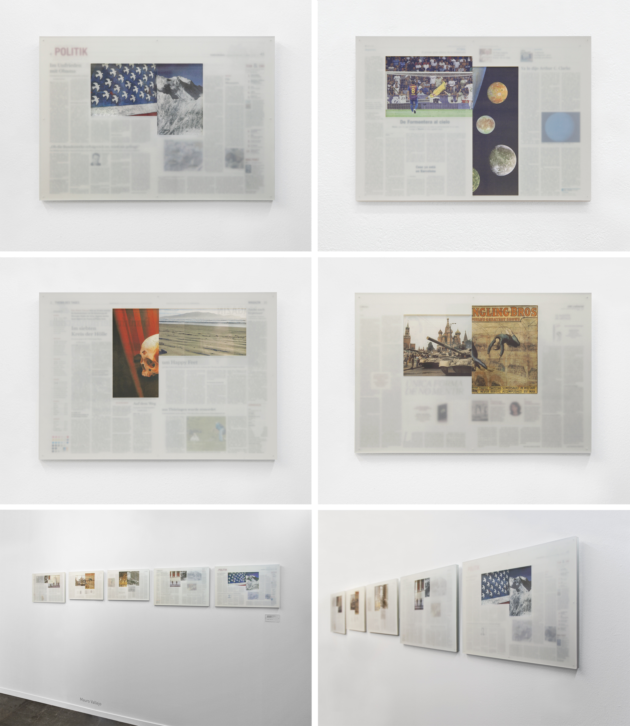 The daily press is used here as a device of multiple art, highlighting both its value as an editable material (every newspaper has a circulation no matter how small) and its message and interpretation. The pieces could be defined as pre-produced collages, (fragments of images placed within one same context, which already existed as such before the intervention by the artist). The work material comes ready and completed, and what is relevant is the selection, the cropping, its new context. Deleuze once said that “collages allow an integration of reality into a work of art”. Therefore, the sole use of newspapers reinforces that theory as the images are born with that vocation: to be the reflection and the study of its time.