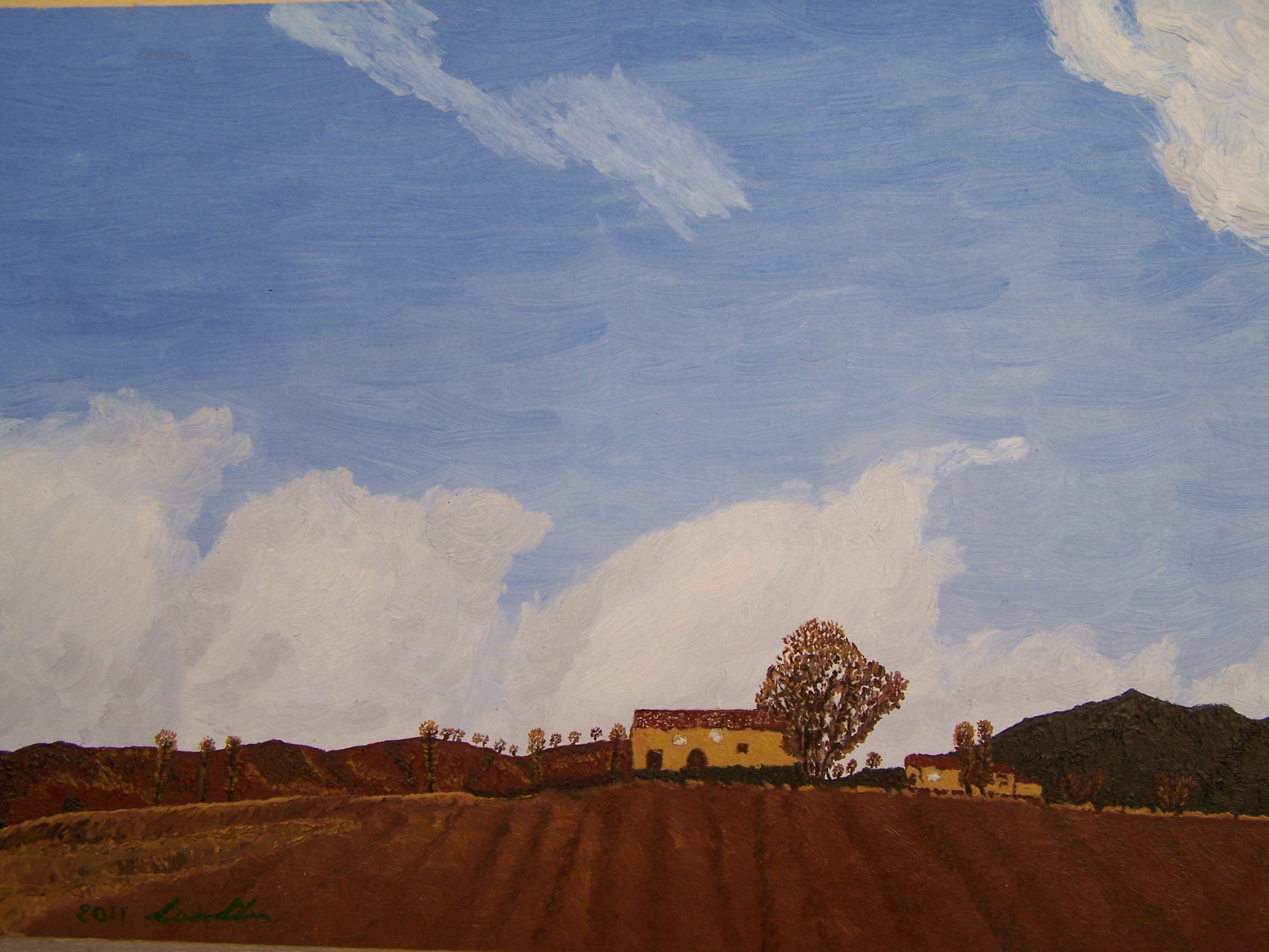 complimenti,una prospettiva particolarissima,sembra esserci due punti di vista ,contrastanti tra di essi,il cielo ha la spaziosita,mentre il casolare e' posto difronte,una vista di una persona che coricata,di spalle,volge lo sguardo all'indietro trovando subito il terreno,casolare e infine il vastissimo cielo.Bellissima