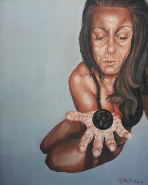 I represent here in a brave moment of self-consciousness, fixed and scrutinizes the ball in my hand, thus creating a dense dialogue between me and the darkest part of myself.
