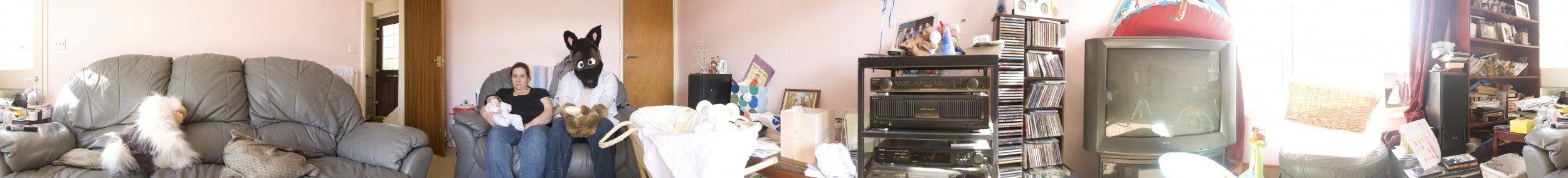 In this context, although at first sight we might perceive the furry fandom as a marginal and strange group, their relationship to their fursonas is in actuality an extreme manifestation of the self-fashioning and difference-encouraging trend visible in western, globalized societies in different forms and to different degrees. This conclusion has informed the photographic representation I opted for in depicting the furries. The 360 degree panorama records without selection, it is de-centered and a-compositional. It treats the subject of the image with indifference, as if it were any other element of the spacial continuum. A striking apparition such as a person dressed in an animal costume is in the end – in the context of the stylistic indifference of the 360 degree panorama - a normal occurrence, just as normal as the other ordinary objects such as household items, buildings or trees which occupy the frame.