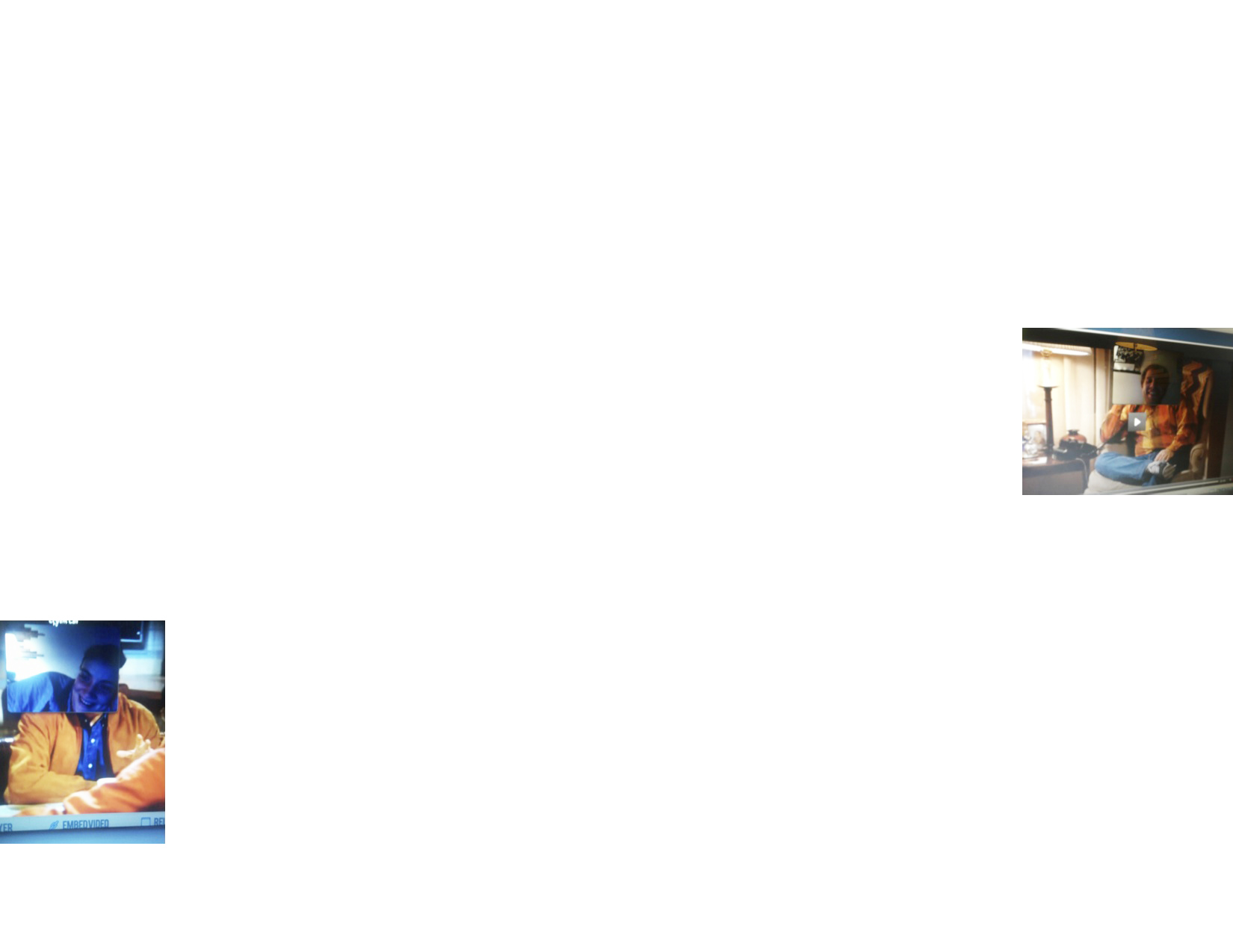One image consists of Barbara Scheed’s head, as seen on Skype, superimposed onto Jerry Seinfeld’s body. The other image consists of Lee Roth’s head, as seen on Skype, superimposed onto George Costanza’s body.