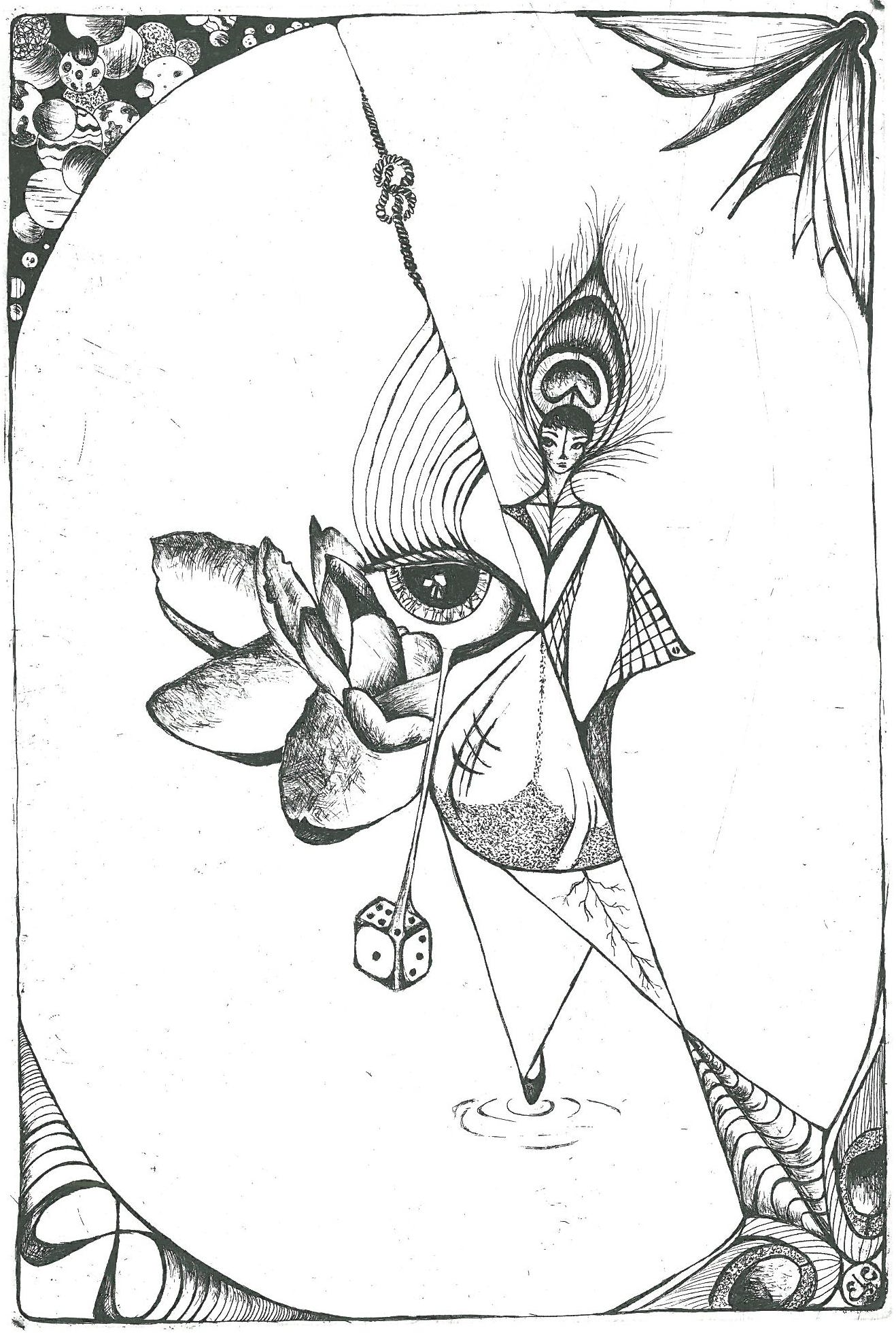 The Pythagorean triangle consists of the graphic sum of the first four numbers (tetra in Greek): from vertex to base they are 1+2+3+4=10, here pictured on the dice. Each of these recalls an element of nature, thus 10 synthesizes the whole that cancels each singularity. The grace of a peacock’s feather cyclically becomes dust inside the hourglass of Time. Life infinitely renews itself and the dice, rolling on the subtle line in between necessity and contingency, is the game played by everything.