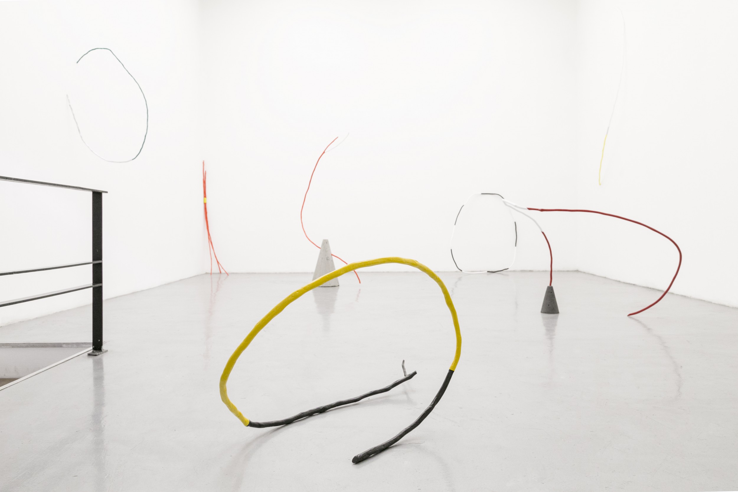 Color compositions associated to traffic or warning signals appear frequently as visual codes that invade landscape. Red-White, Orange-White, Yellow-Black, Yellow-White, Black-White: these combinations invade all places inhabited by men; they swarm through streets in official or informal signaling —on streets and sidewalks, on signs, advertisement, walls, posters or painted rocks and cement lumps— and extend all over roads that go through valleys and mountains, getting denser once again in towns and cities. These warning signals expand through the landscape as men colonize spaces, as if they were a replacement for displaced natural elements. Men carry along the message of an imminent danger, of a latent risk. These compositions of color bands, lines, arrows, crosses, letters or plains, interest me as a memento mori, constant remembrances of lifes’s fragility and death’s inevitability. For these works I used fragments of dead native vegetation found in woods near Bogotá (Colombia) that are logged for urbanism. I select these thin, large and spiraled branches because of their fragility and odd forms, as if they were part of a mutant nature. I painted these fragments with the mentioned color combinations, using car laquer, converging the controlled, strict and artificial character of the painting, with the light, fragile and organic character of the branches.