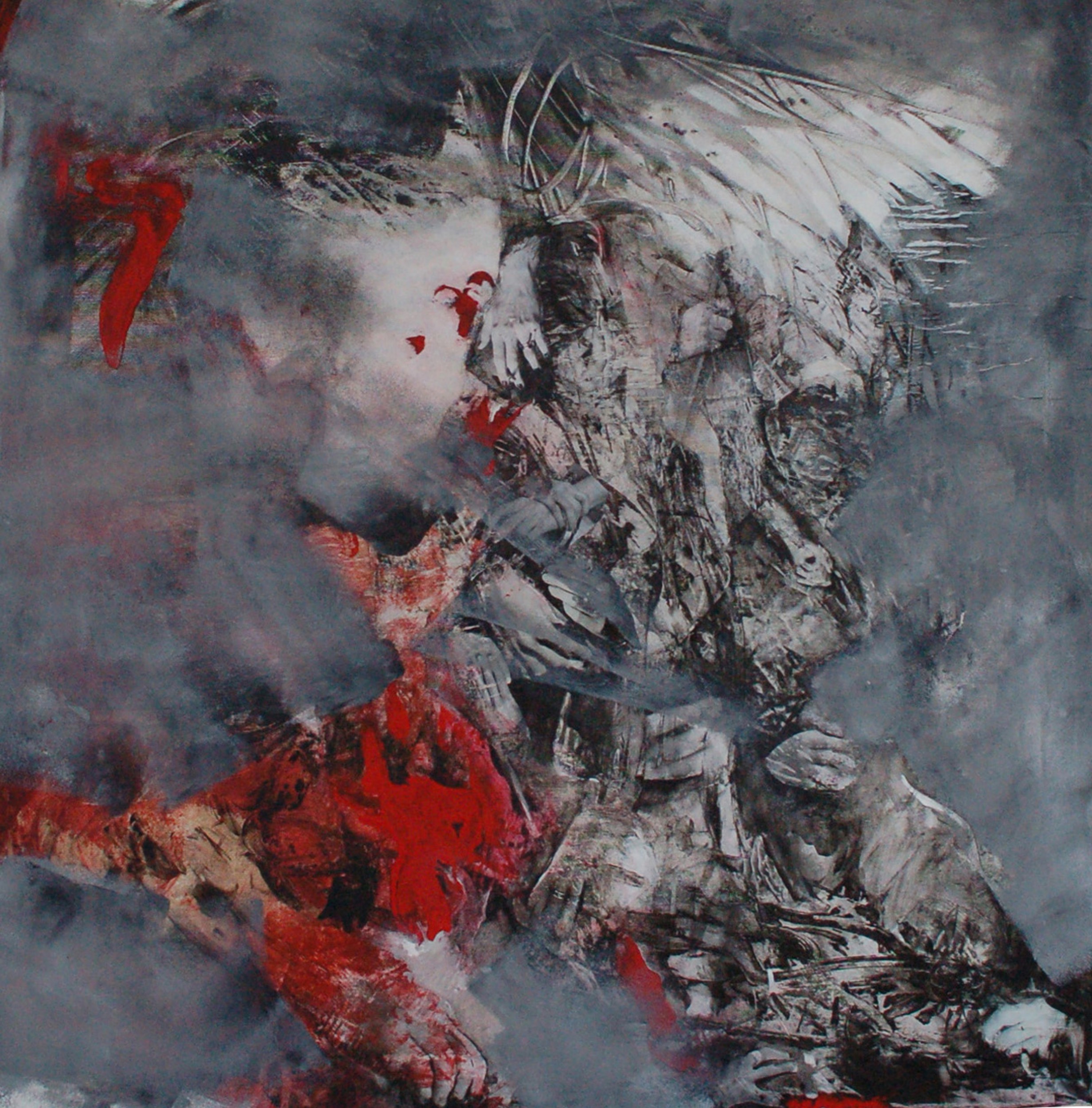 The iconography of the painting is characterized by the hands in black and white. I represented the gesture of affection that through the touch of hands to relieve pain.