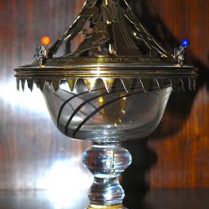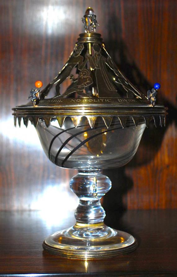 The Bowl in lead crystal, platinum canes,and a 18ct solid gold star in the stem.The pierced, engraved and cast silver gilt cover mounted with coral,bone,lapis and meteorite to represent the Earth, Sea and Universe.