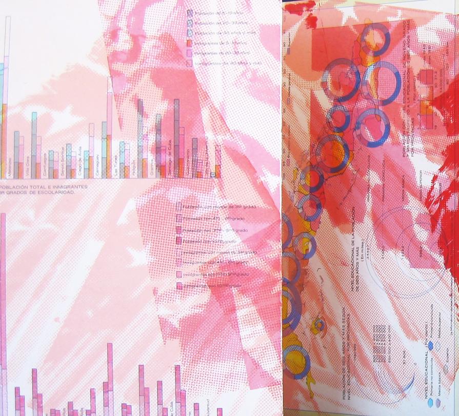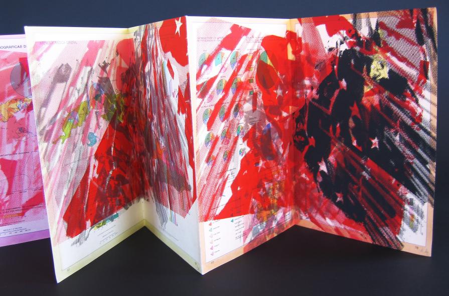 Silkscreen on found Cuban geography text printed at the Taller Nelson Domingez, Havana, Cuba.