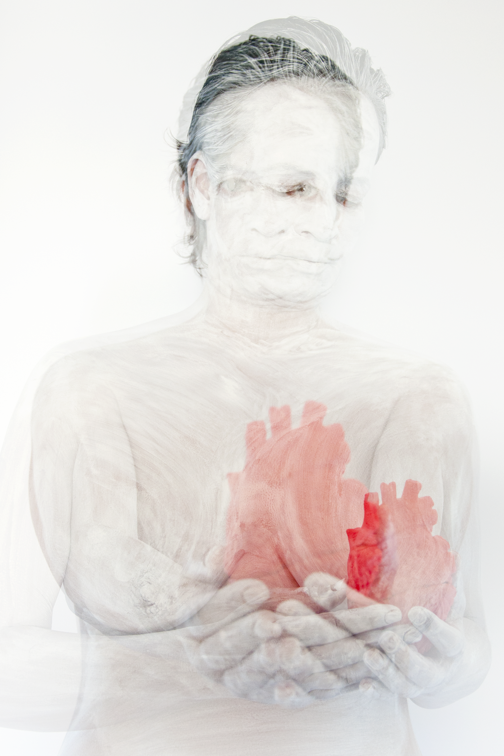 Self-portrait of me offering my heart to ... you. Offering my heart is inspired on one of the iconographic drawings, ‘Sincerita’, by Cesare Ripa (late 1500 - early 1600) . I have chosen to use white body paint and double exposure to give the photograph a vulnerable look and feel. The other reason I used double exposure is because of a certain duality: on one hand I love and cherish myself, my heart. On the other hand I want to share/show myself to the world, with a watchful eye.
