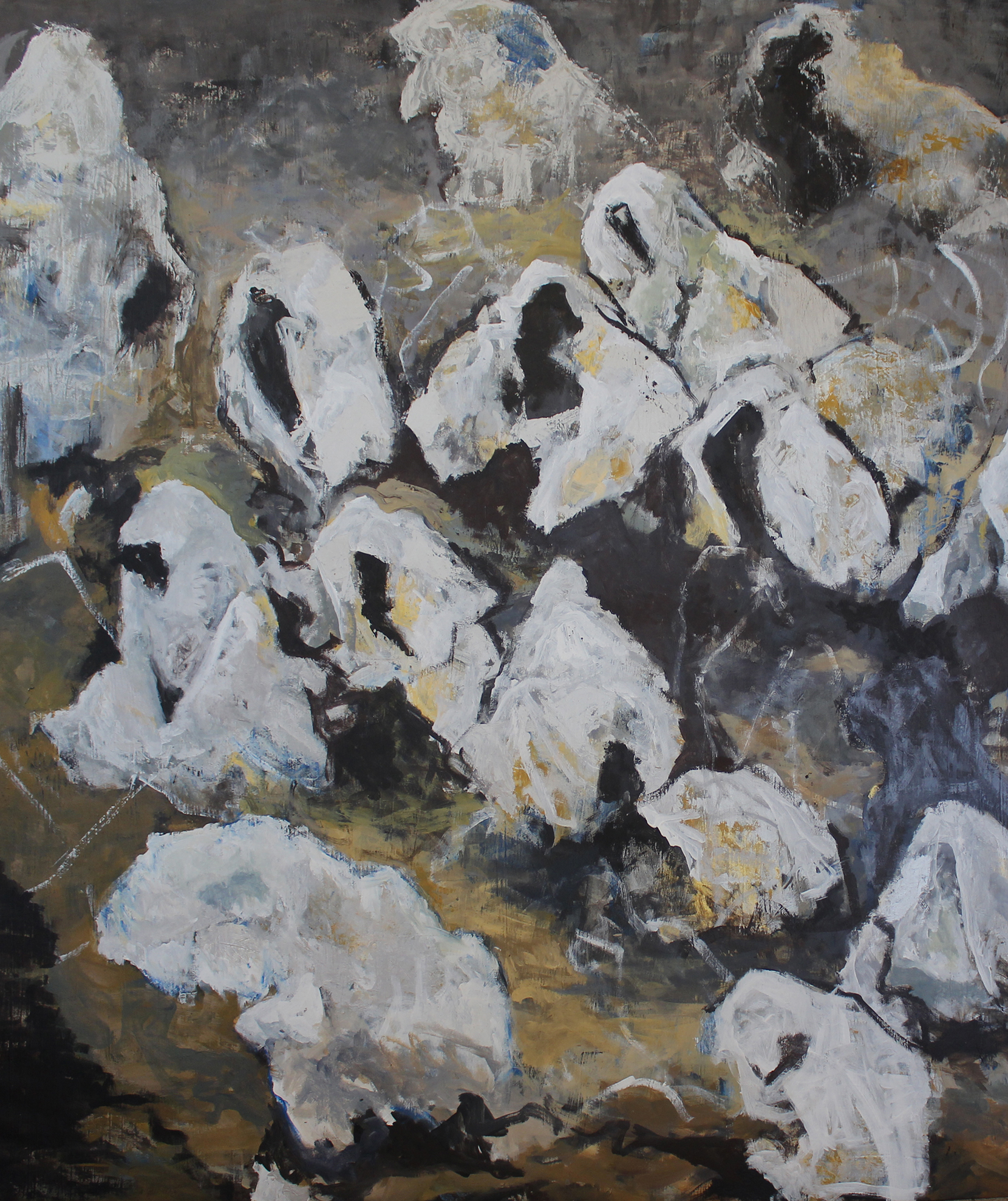 The journey intended as separation, memory, man's birth, migration, is developed through the elaboration of a video and paintings on canvas and paper. The colors and materials used in the works enter the story of the project: bitumen as a bond to the earth, as well as land use, the presence of gold and silver that "iconize" these images reveal a profound need for spirituality.