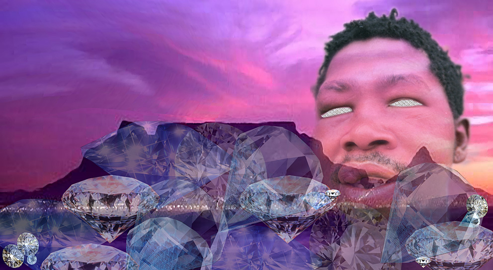 Have you seen the Cape (Het jy die Kaap gesien) is a sadistic game or joke when a young farm boy is dangled by his ears and asked have you seen the beautiful Cape. But as set against such expectations of beauty and wealth a signifier diamonds and cubistic form one is confronted with the harsh reality the poverty stricken mainly poor coloured people of mixed race the Bergie , a phenomenon during the Apartheid and Apartheid post era of South Africa. A Bergie is a term for a subsection of vagrants in Cape Town who live on the slopes of Table mountain beg for money and food in the city and addiction by and large to ease their angst methylated spirits Ijuxtaposed his photograph