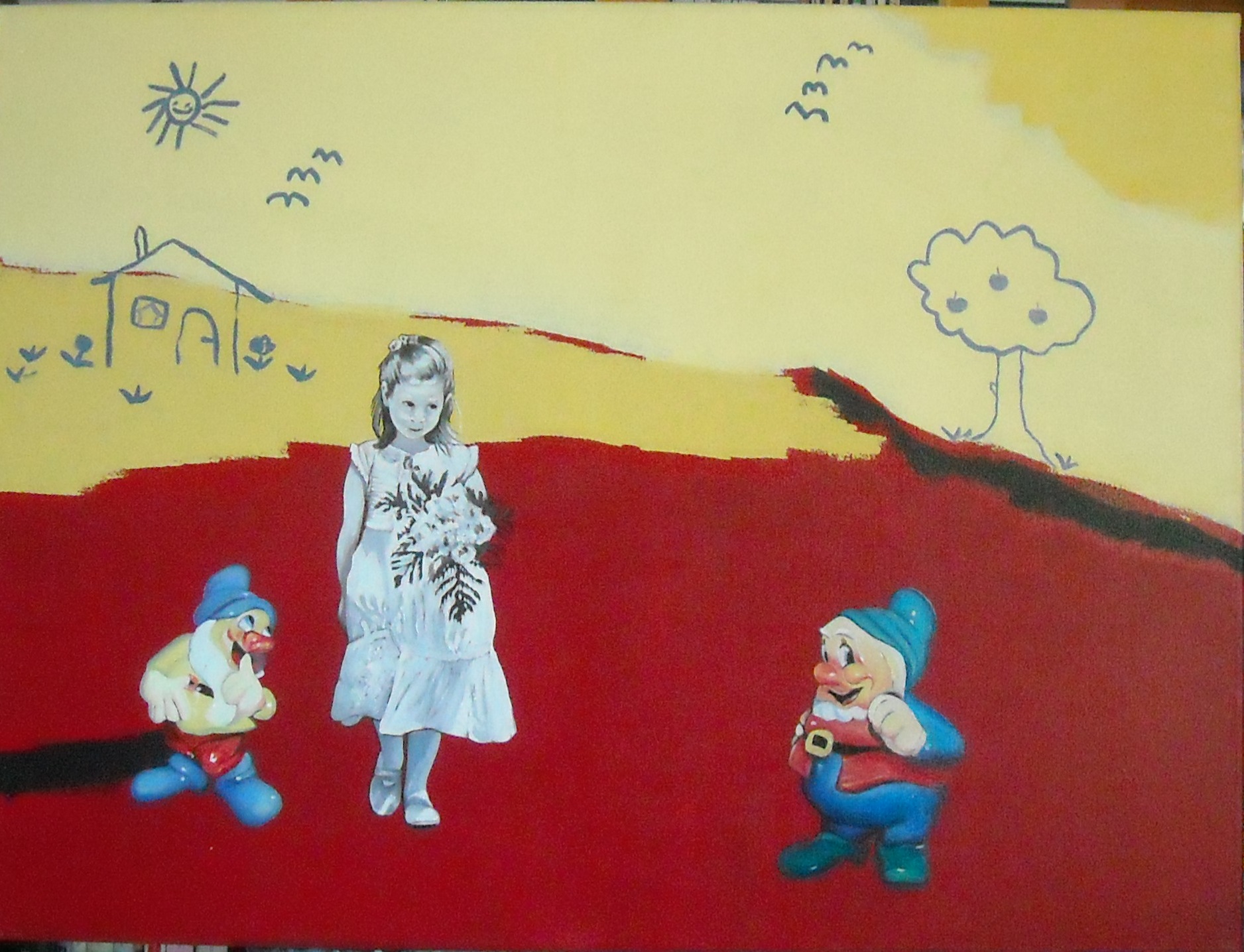 Superbo cortocircuito metapittorico fra il fondo(lavagna) piatto e liricamente infantile e le figure principali a tutto tondo:mix linguistico che si serve della metafora dell'infanzia per parlare del fare pittura oggi attraverso la fusione di registri linguistici differenti!Complimenti!