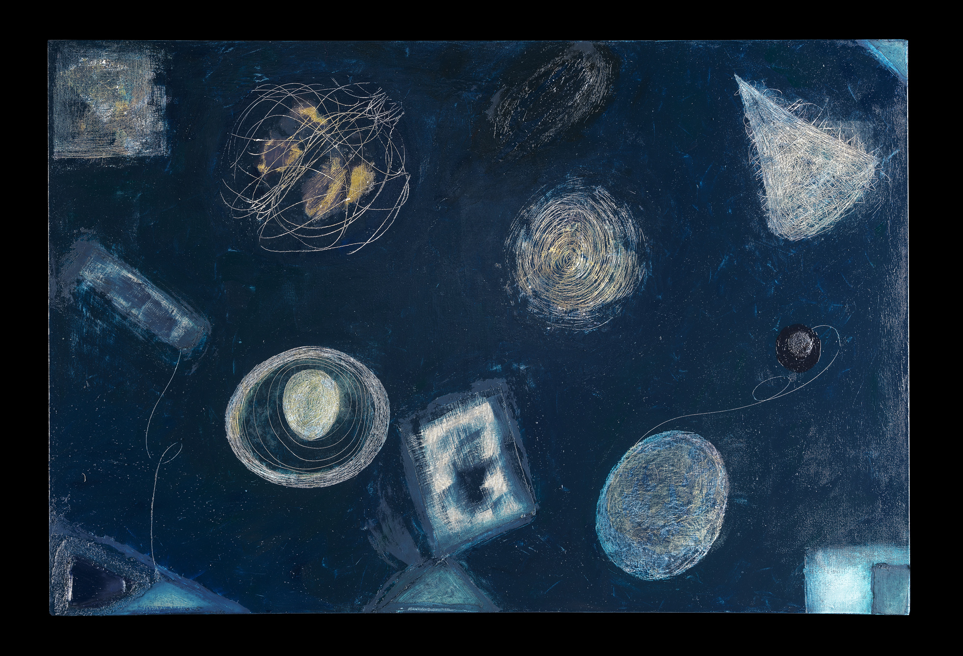 un triangolo, un cerchio, un quadrato, ellissi .... ho subito pensato a Flatlandia di Abbott, un mondo popolato da forme geometriche animate di vita propria ... poi ho visto nello sfondo blu tuo padre, cui hai dedicato il tuo lavoro e tu con le tue esperienze (le forme geometriche) sviluppatesi sul suo substrato ... molto bello