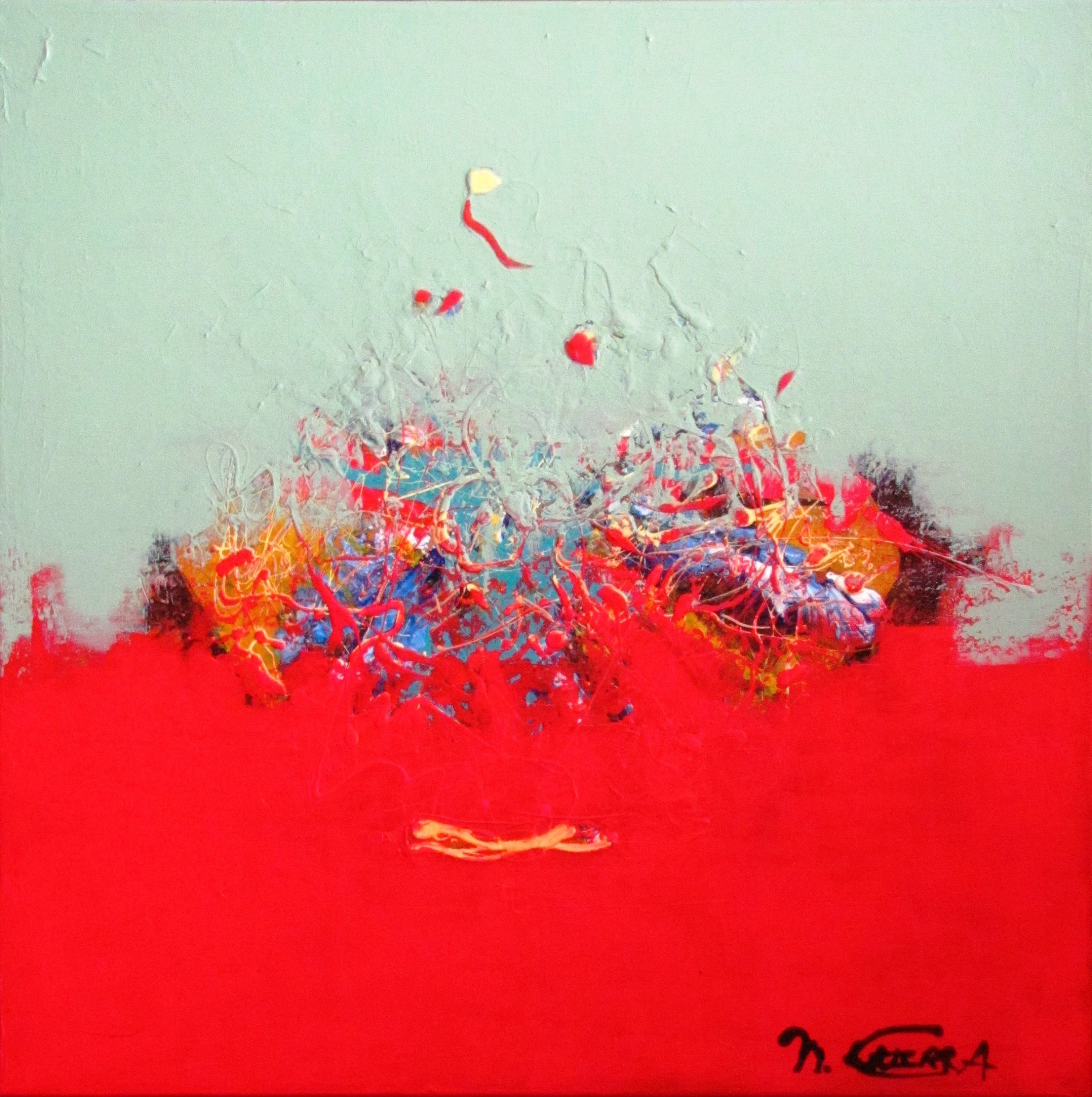 During my travel in Indonesia, I did a hike of 3 days to reach te top of the Rinjani Volcano at Lombok. This is an expression of my admiration for this mountain. The hot red inside the -still active- volcano and the greenblue of the beautiful lake in the middle of it.