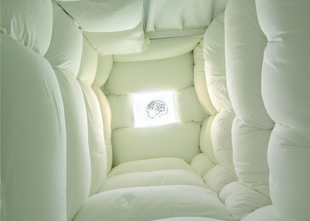 BrainCell is a piece inspired by Ibsen’s play Gengangere (Ghosts, 1881). Darkness is on stage, representing the shadowy side of our conscience and its infinite contradictions. The padded walls of this installation recall an isolation cell. Inside, a woman’s voice can be heard talking freely and incessantly “to herself”. Her voice is like a recording of thoughts in a stream of consciousness. A video animation on the ceiling shows a brain in the process of twisting until it is completely distorted before returning to its normal shape once again.