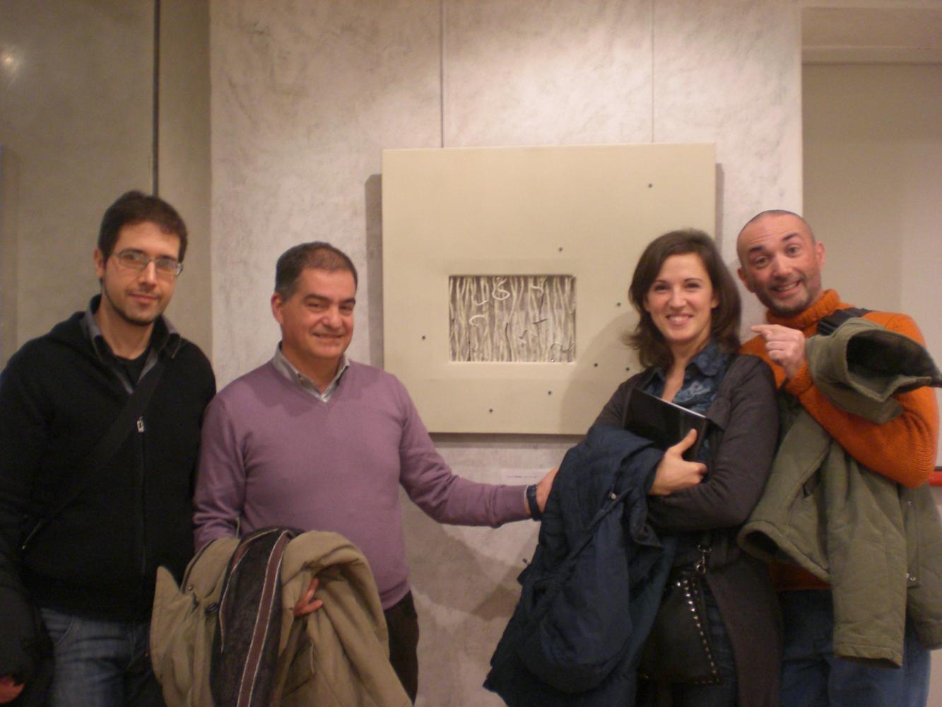 Filaments equal to signs perched on the edge of an open space on the whiteness float to enter in the work of metal, leather and canvas Chiara Cadore, an idea of matter between fantasy and reality. The narrow braid reinforced touched, moved and shaken. In the rectangular area created the spectacle of wandering points.
