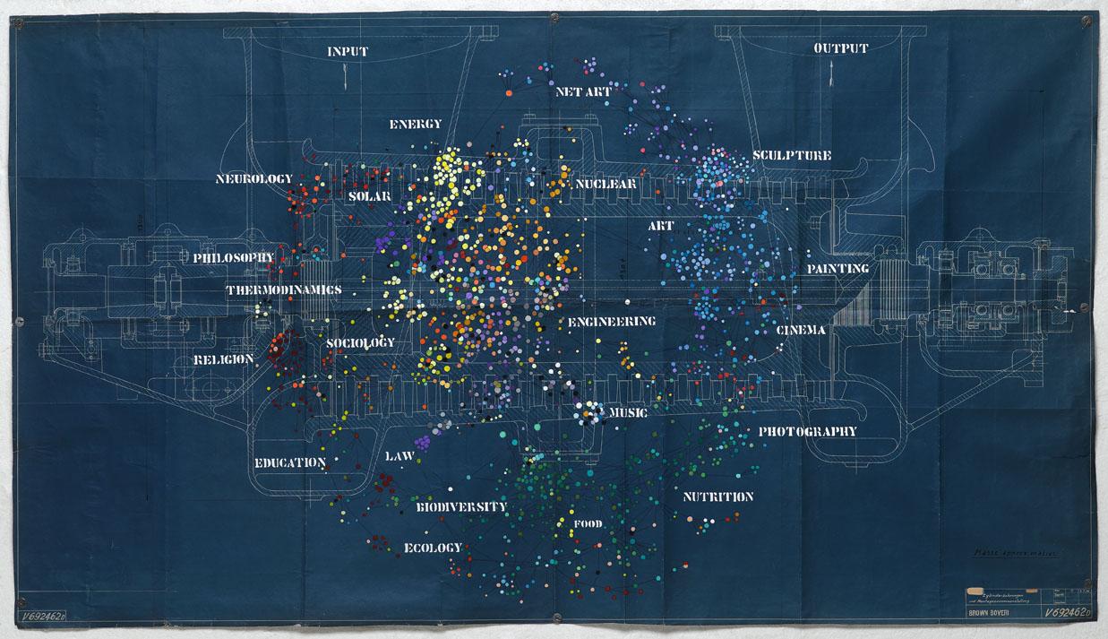 L'opera di Angelo Zani - “Montagezusammenstellung” - è realizzata ad acrilico, grafite e china su carta. La base cartacea è un plottaggio originale (del 1936) della Brown Boveri che rappresenta una turbina a gas. A questi si sovrappone un’immagine proposta dagli scienziati del Los Alamos National Laboratory che rappresenta la “Map of Science”. La Map descrive i percorsi virtuali che compiono gli scienziati per accedere alle informazioni disponibili in rete prefigurando quindi una sorta di mappa neurologica del processo creativo di formazione delle innovazioni. Le discipline classificate dal Getty Research Institute’s Art and Architecture Thesaurus sono selezionate e relazionate graficamente, in una “tavola di montaggio” dove l’arte rappresenta il propulsore della creatività.