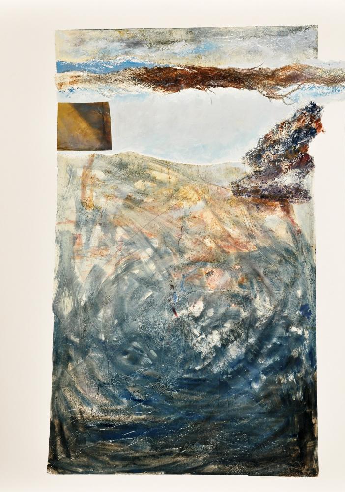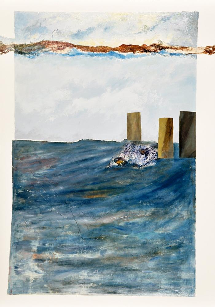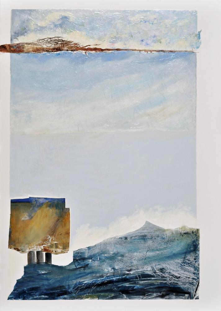 Colours that remind us of the sea, the sky and the earth; an aesthetically balanced composition in which the equilibrium is interrupted by the white of the paper making the observer aware of a change: The earth and the sea will react as they did on the 27 of February in Chile.