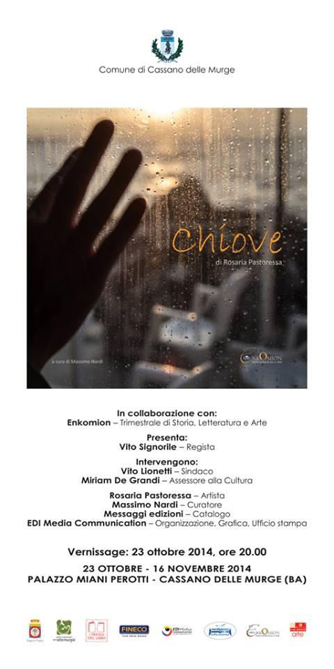 The exhibition offers scenarios known and less known of the Apulian landscape from glimpses of Cassano, passing through the features and Trani, Polignano and arriving on warm beaches of Brazil. Directors, actors, musicians and internationally acclaimed photographers lend their face, their expressions sometimes surprises, sometimes dramatic, to compose the "portraits" of Paleti in addition to "harmony of the body" that collects the most intense and representative picture of the subject-man, while "baresità" is populated by fishermen from each other tightly hands gnarled octopi and collect nets at the end of the day.But it's rain the true protagonist of "Chiòve". They are immobilised in time or in movement