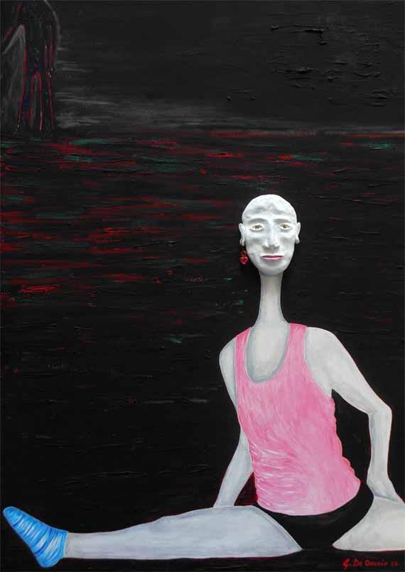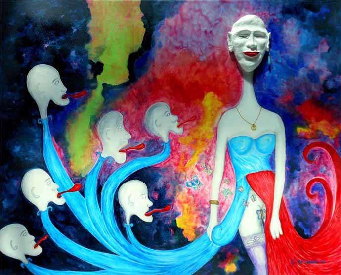 of these "artists", often anonymous artists or known only to insiders. How can we forget, in this connection, the graffiti of primitive men, or the illustrated covers of "Domenica del Corriere" in more recent times? Today, computer, television, camera, video camera, etc.. pictures broadcast any time of the day or night and in every corner of our global village, so much so that some of theseimages become very often "icons" of an event. And it is precisely from these icons Giorgio De Cesario began his path. Thechange is the transfiguration of these symbolic images, not just playing graphic-pictorial but a reinterpretation of all the details, a reworking by fantastic color and color effects. Here is explained the title of this collection: from current events to fantasy. The fantasy is a literary genre that developed in the second half of the nineteenth century, and its dominant features are the myth, the supernatural, fantasy, allegory, metaphor, symbol and surreale.In this line fall those stories of fantasy literaturewhere it is lacking any scientific explanation of the mysterious and surprising. From the literature, the fantasy was quickly extended to the media,especially in film, television, comics and, in particular, to video games. And 'then the symbiosis and osmosis of these two worlds, the reality of the present and the unreality of the fantastic, which arise new works by Giorgio De Cesario. There are, however, all the elements that have always characterized its production: its unique technique of faces in clay in relief on canvas, real earrings on the lobes of thefemale characters, color schemes is very bright in the background that in the representation of all dettagli.Il draws once again the