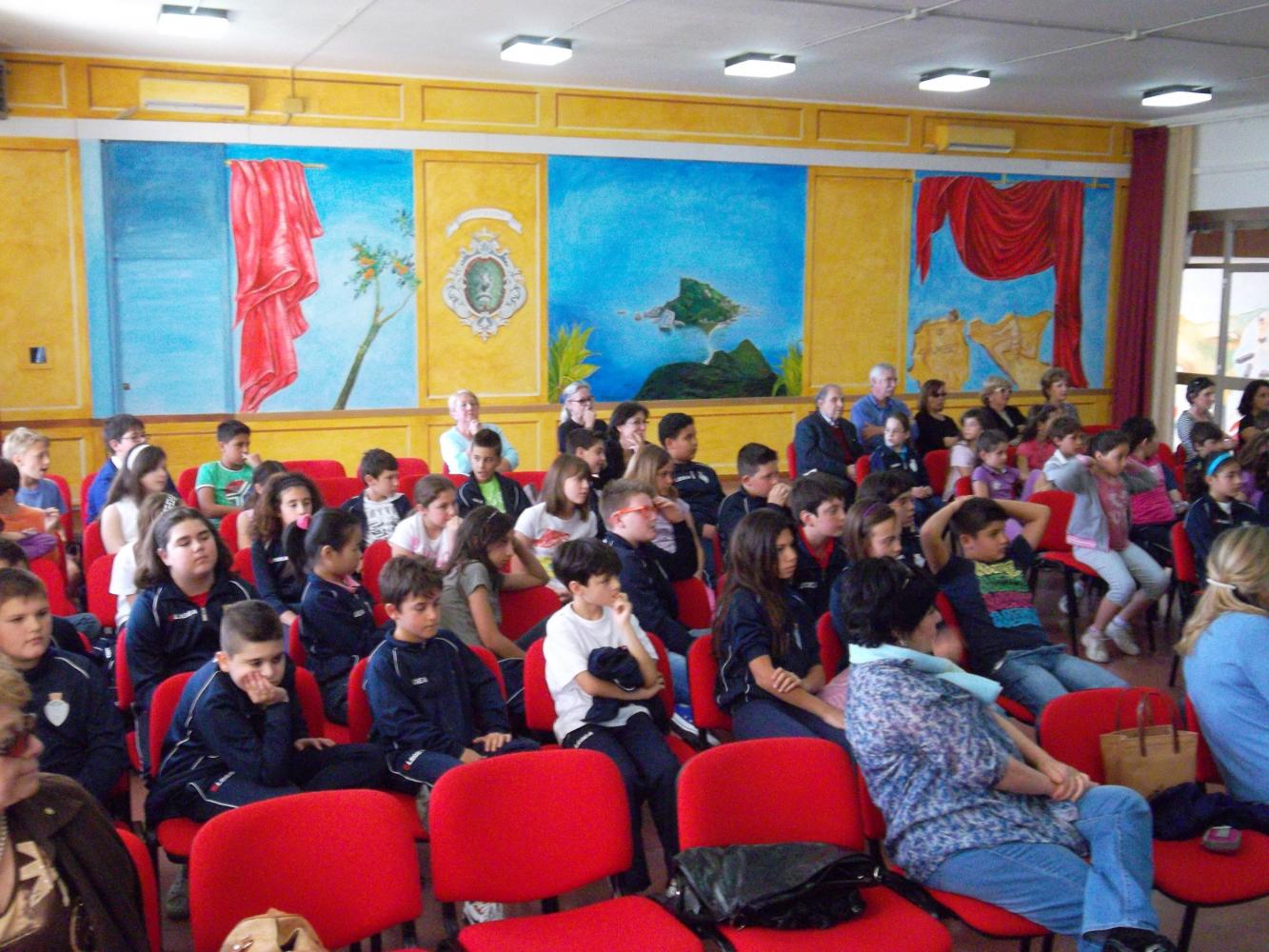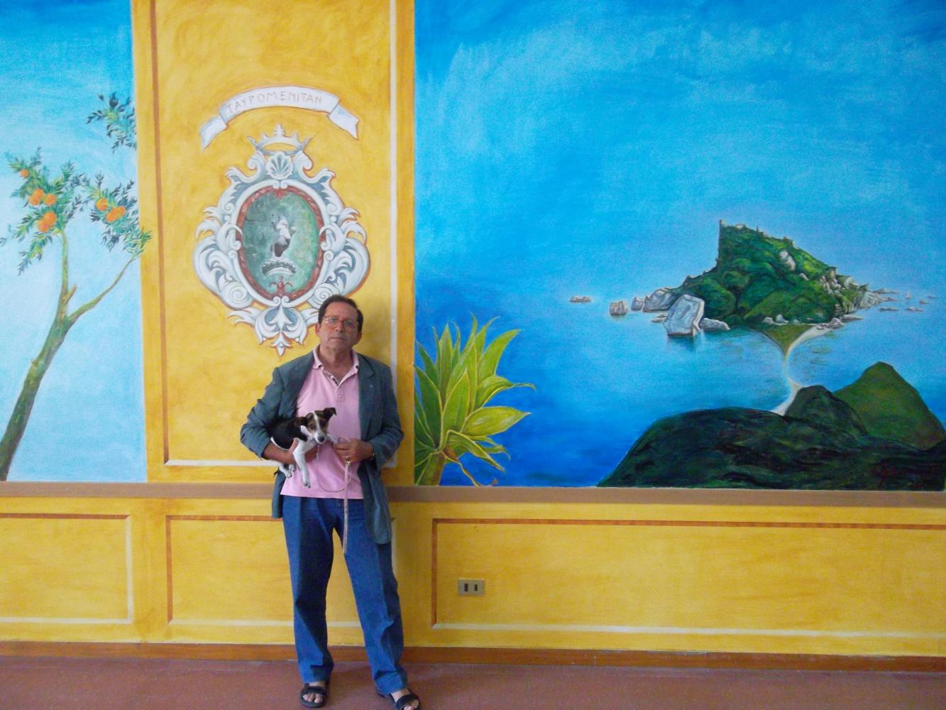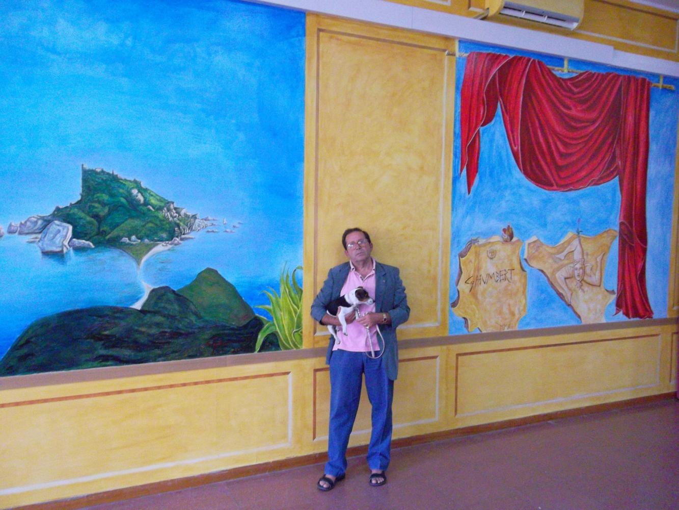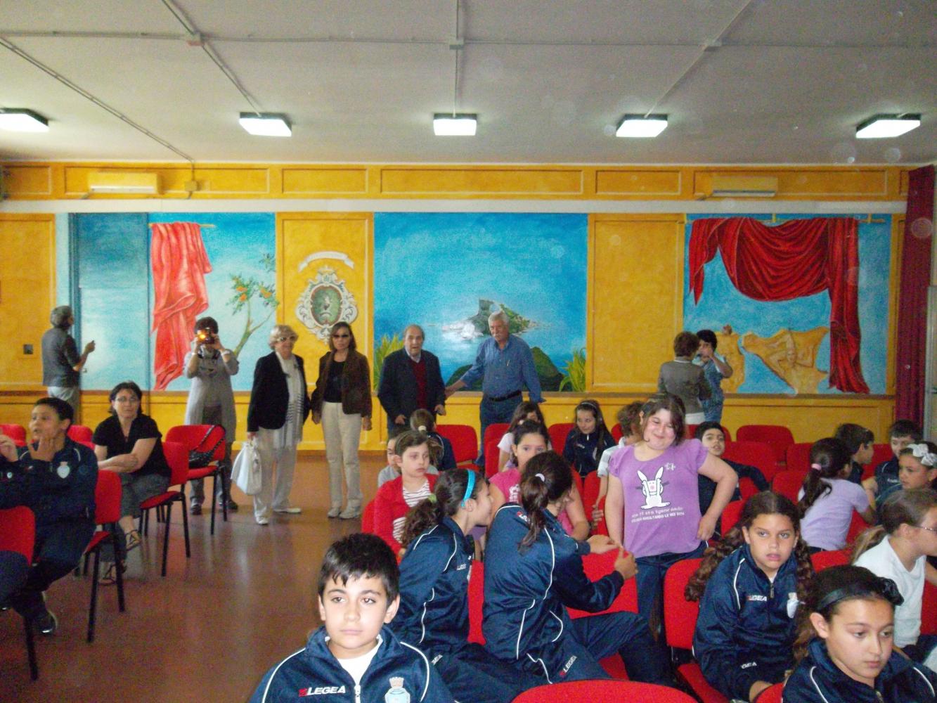 GHUMBERT gives price to children for the Exibition organice by Club UNESCO of Taormina Valli d'Alcantara e d'Agrò in the "Aula Magna" of the scholl where GHUMBERT di CATTOLICA, as President of the Association GAT Centaurea, has realised a large murales of Isola Bella of Taormina 14 mt large for 4 mt high