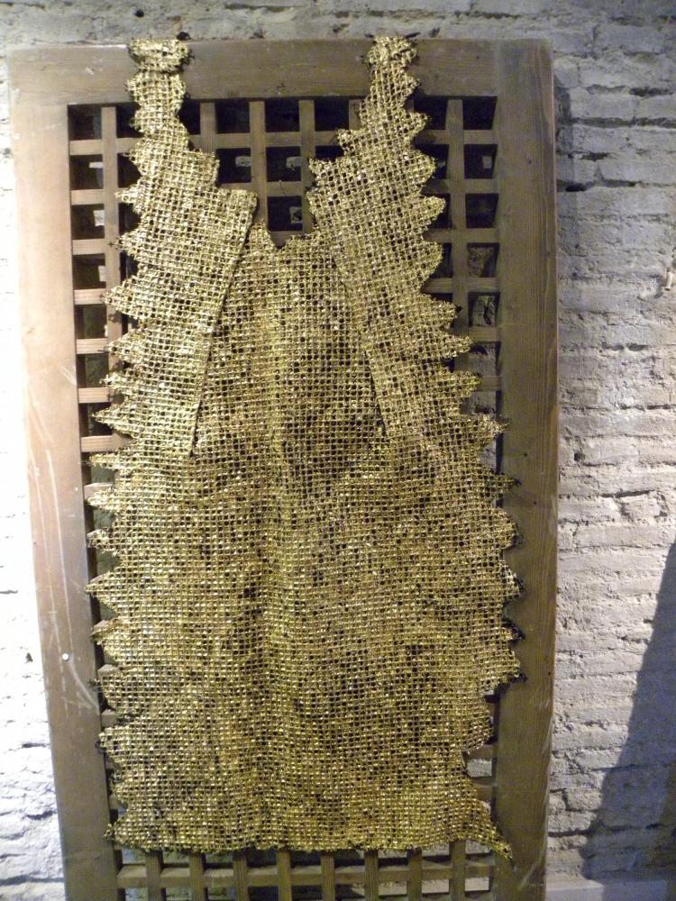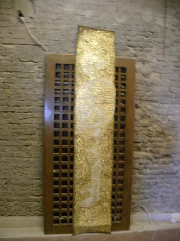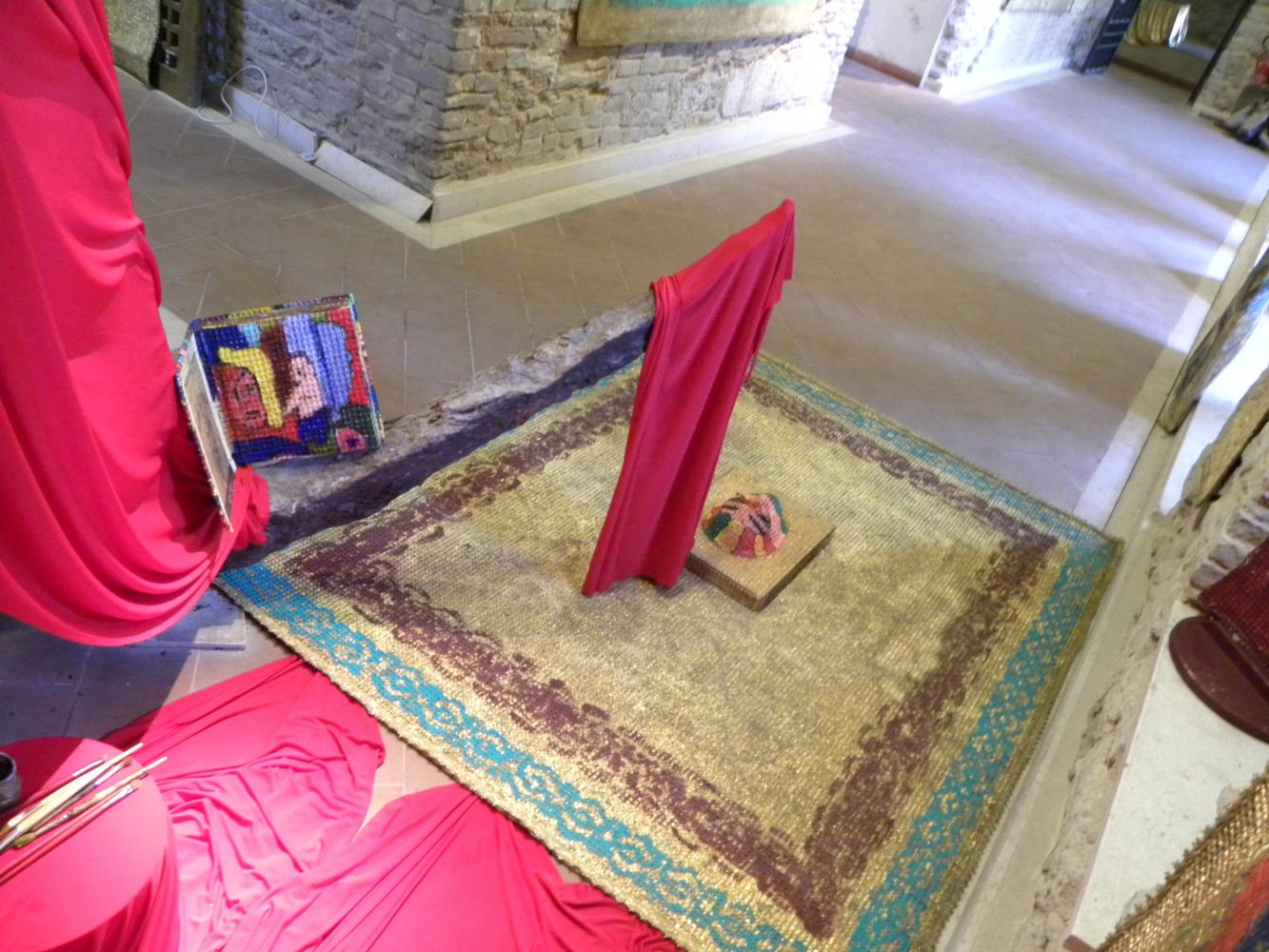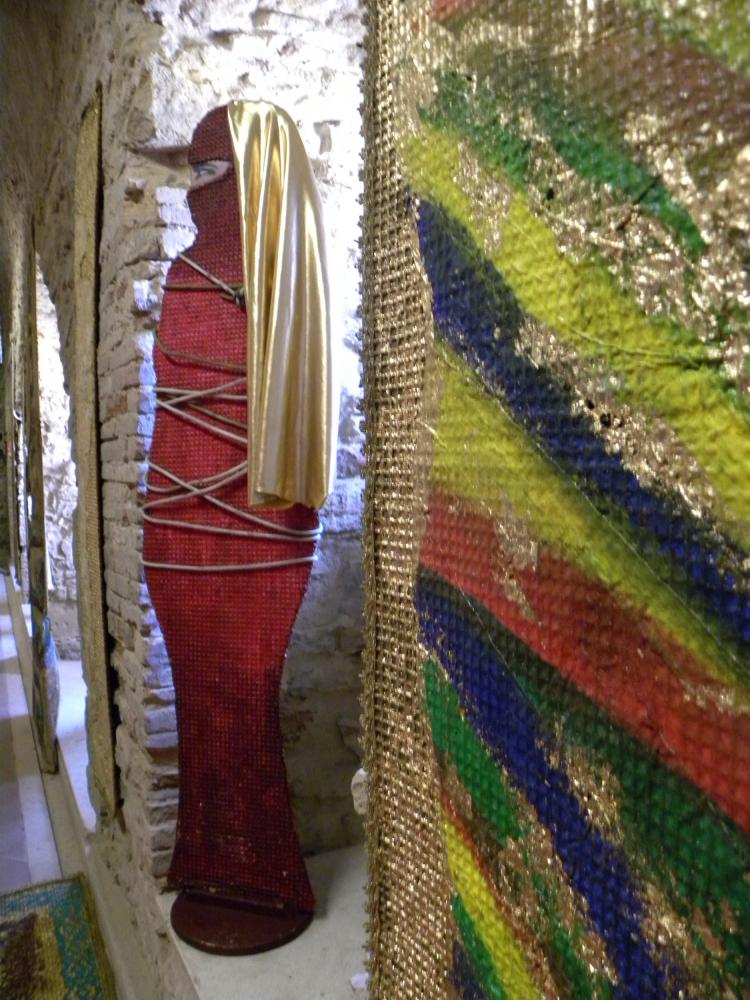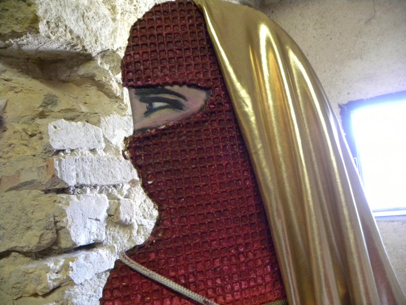 To merge these two worlds gold for a totally different world, it seems, Rosa Didonna using an anti-magnetic system in which the two opposites attract and repel each other, an evocation of white fabric that defines the boundary of the space stones surrounded by stoning and violence; while the Western woman wants to be a still-image of the negative message in a positive-negative-positive uniting them in a single emblem imaginary between East and West.