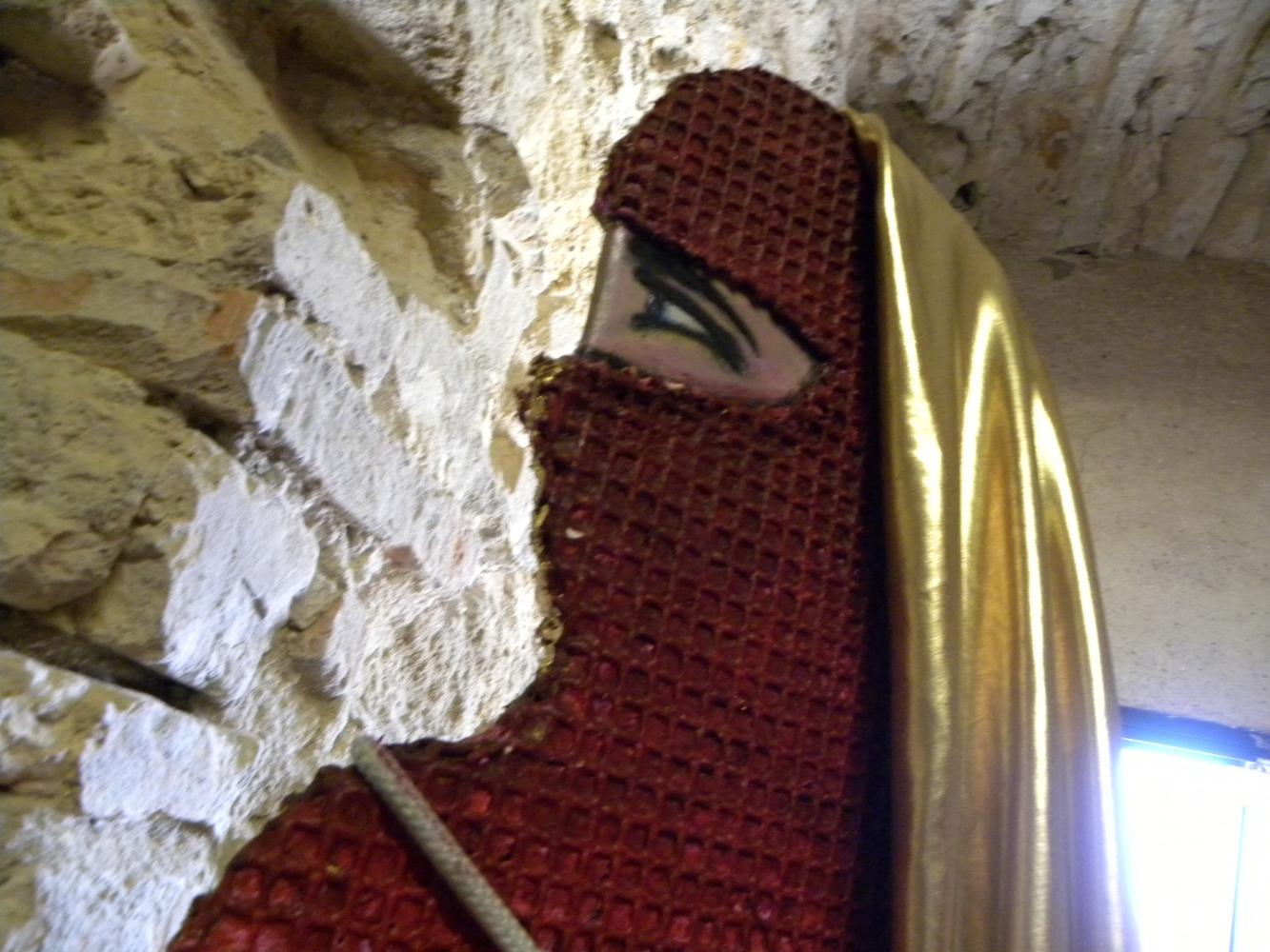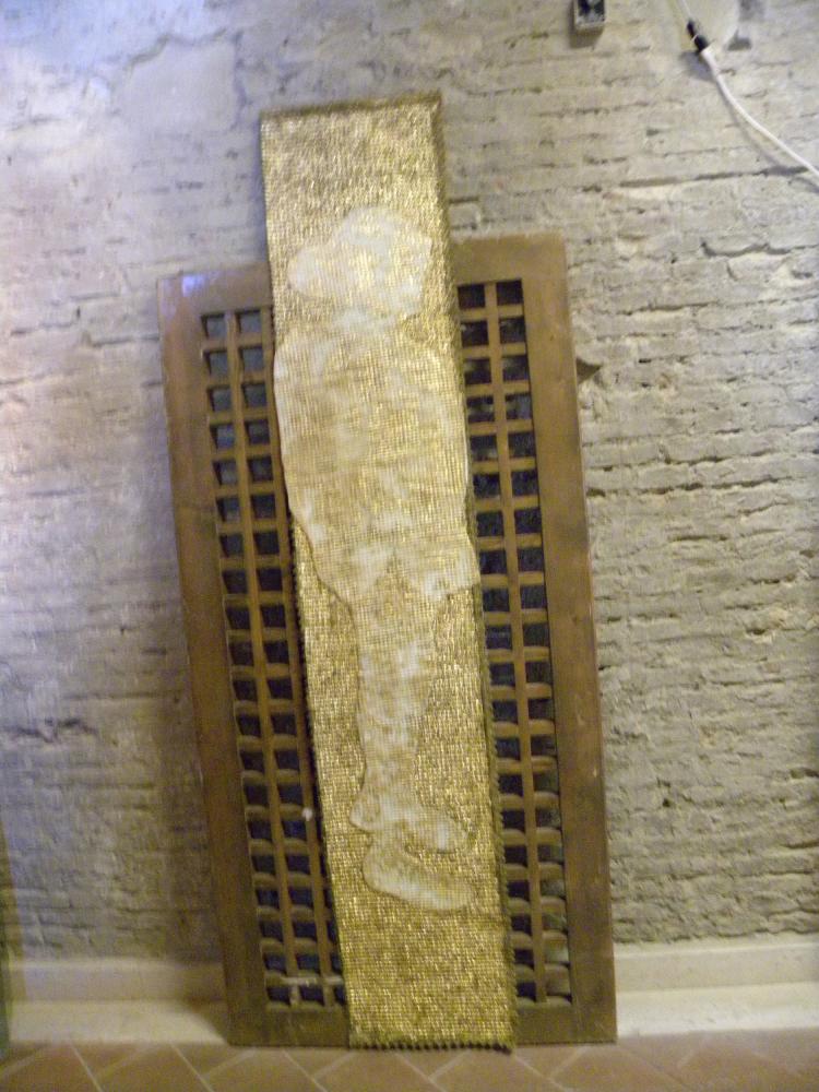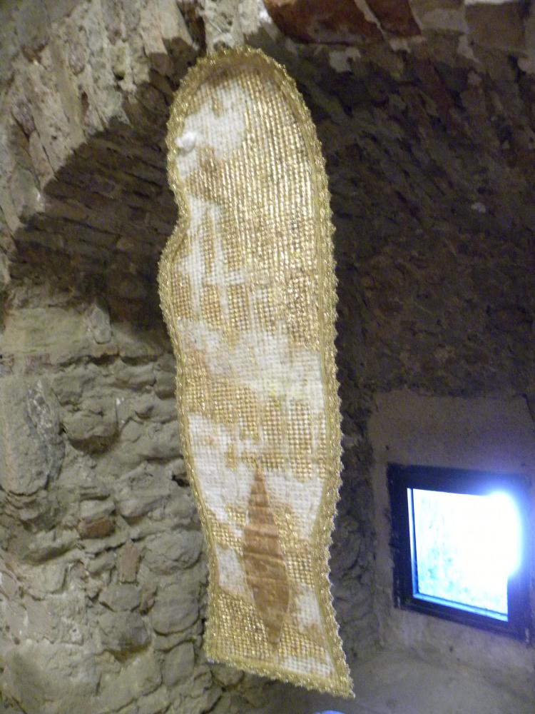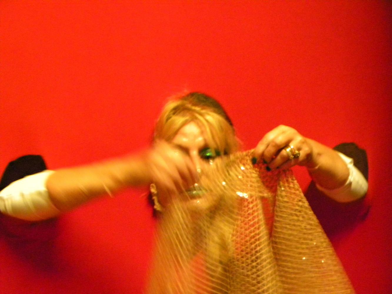 To merge these two worlds gold for a totally different world, it seems, Rosa Didonna using an anti-magnetic system in which the two opposites attract and repel each other, an evocation of white fabric that defines the boundary of the space stones surrounded by stoning and violence; while the Western woman wants to be a still-image of the negative message in a positive-negative-positive uniting them in a single emblem imaginary between East and West.