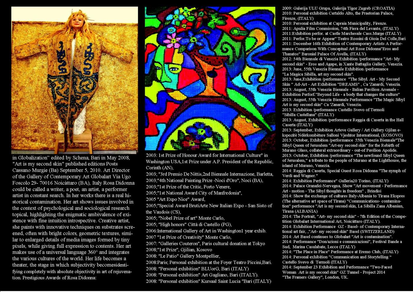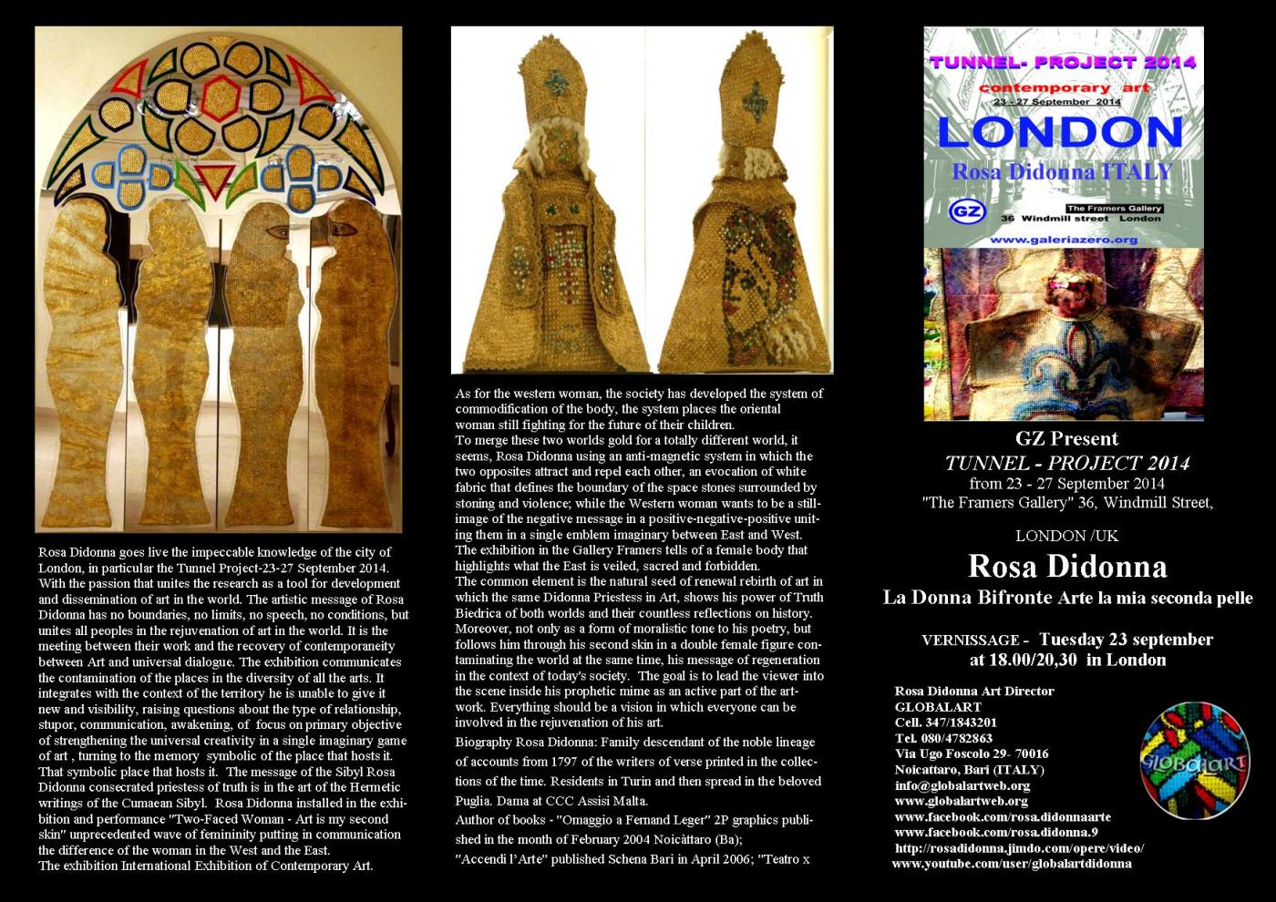 Il suo messaggio è di rigenerazione morale nel contesto della società odierna, i cui costumi, pur diversi tra loro,come il passato e il presente, tracciano aspetti dello stesso stile di Sibilla, figura retorica molto utilizzata dall’autrice,dove l’artista dimostra la grande capacità di penetrazione storiografica.Rosa Didonna goes live the impeccable knowledge of the city of London, in particular the Tunnel Project-23-27 September 2014. With the passion that unites the research as a tool for development and dissemination of art in the world. The artistic message of Rosa Didonna has no boundaries, no limits, no speech, no conditions, but unites all peoples in the rejuvenation of art in the world. It is the meeting between their work and the recovery of contemporaneity between Art and universal dialogue. The exhibition communicates the contamination of the places in the diversity of all the arts. It integrates with the context of the territory he is unable to give it new and visibility, raising questions about the type of relationship, stupor, communication, awakening, of focus on primary objective of strengthening the universal creativity in a single imaginary game of art , turning to the memory symbolic of the place that hosts it. That symbolic place that hosts it. The message of the Sibyl Rosa Didonna consecrated priestess of truth is in the art of the Hermetic writings of the Cumaean Sibyl. Rosa Didonna installed in the exhibition and performance "Two-Faced Woman - Art is my second skin" unprecedented wave of femininity putting in communication the difference of the woman in the West and the East. The exhibition International Exhibition of Contemporary Art.