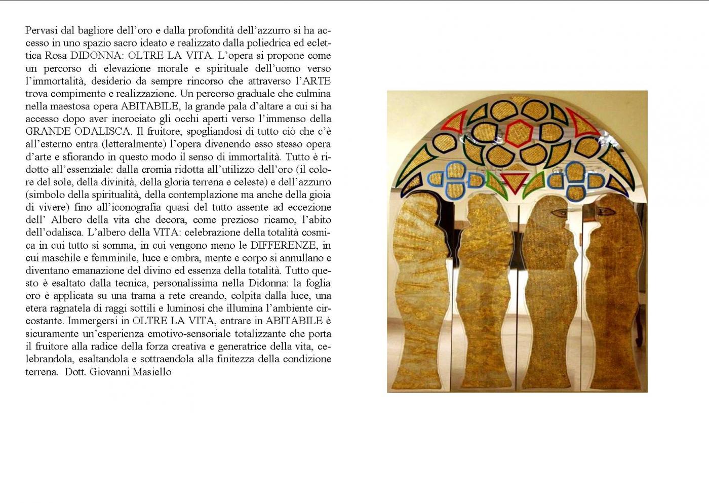Pervasi dal bagliore dell’oro e dalla profondità dell’azzurro si ha accesso in uno spazio sacro ideato e realizzato dalla poliedrica ed eclettica Rosa Didonna: OLTRE LA VITA.