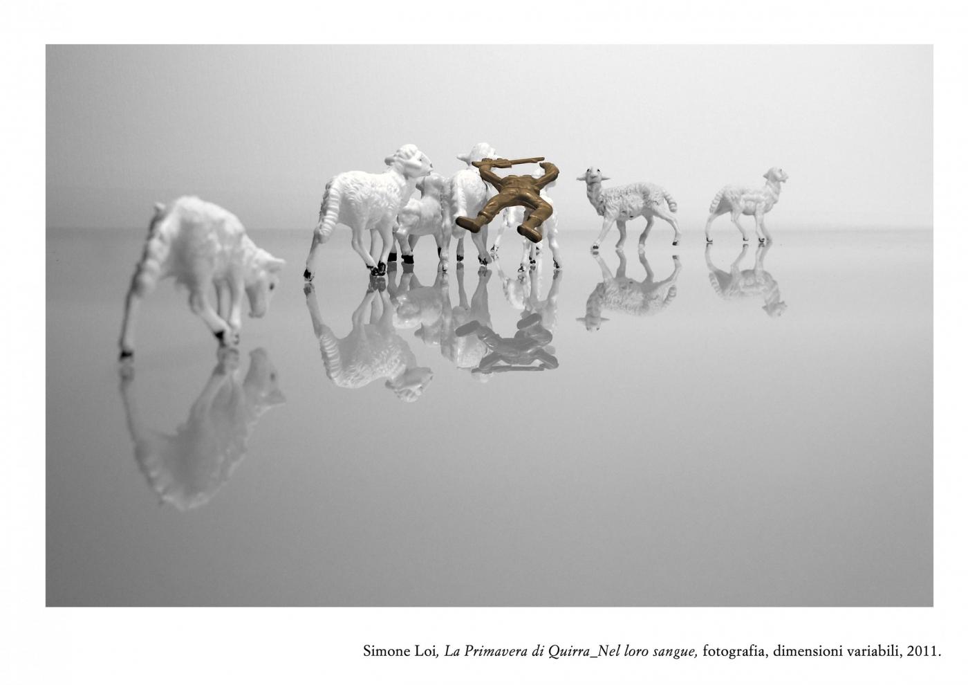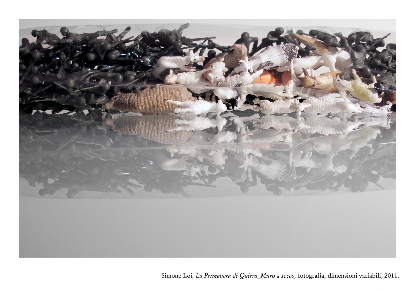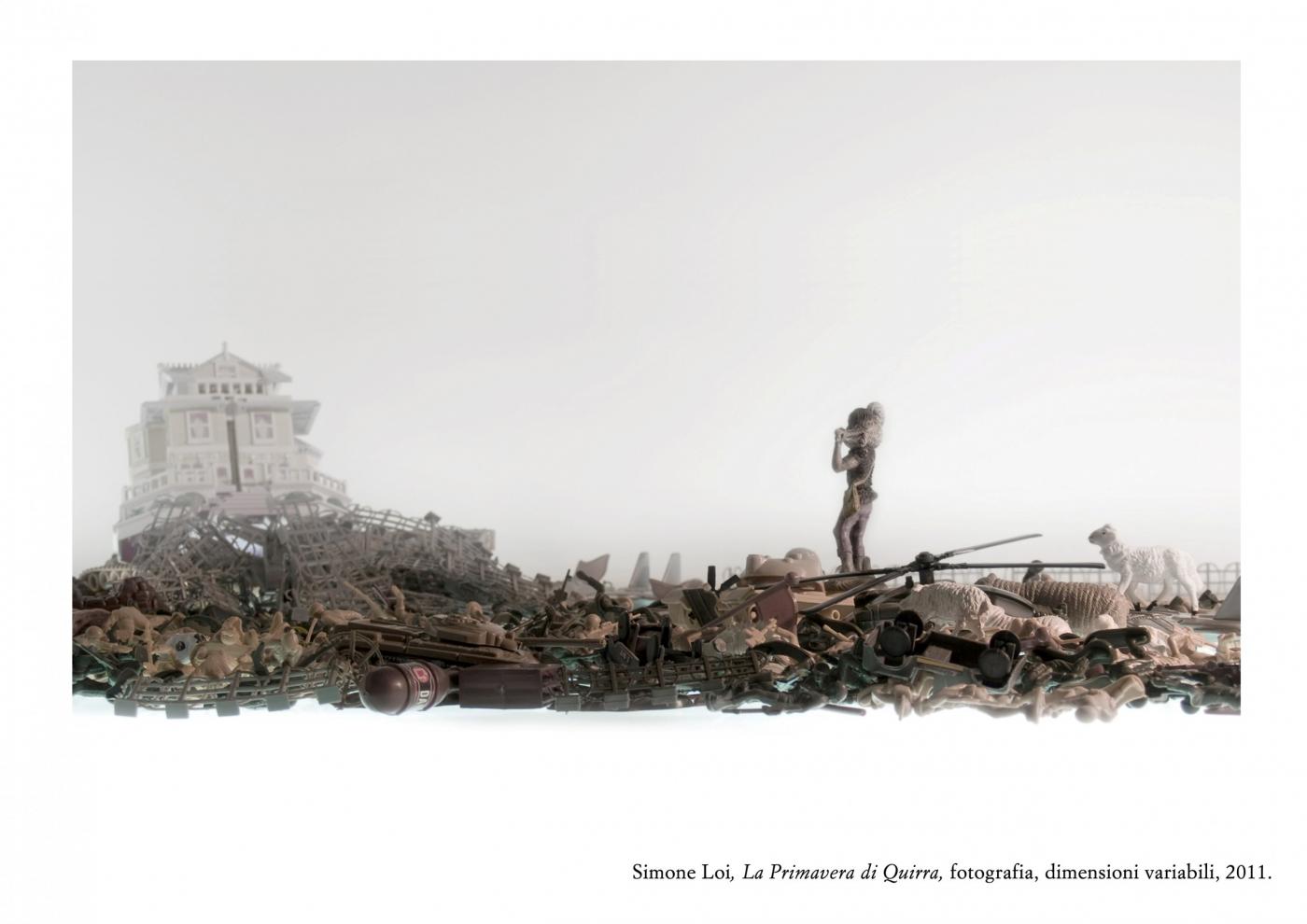 Poised between artificial and natural nostalgia, the search continues in the Loi atmosphere of war "Spring Quirra", where soldiers and machines mix and mingle among the highlights of their lifeless forms. A post-war landscape populated by residues of games once again a metaphor for a life lived in ephemeral balance between artifice and reality, is made piece by piece in a dimension without time and space. The pastoral world, the Sardinian, is candidly victim of devastation from afar, but did not give up and resist the usurpation of their lands. Finally, the bucolic images are combined in this game of war in a microcosm where everything is fiction except death, because Quirra every battle is artificial, false and useless training for life, where man is not allowed to choose otherwise.