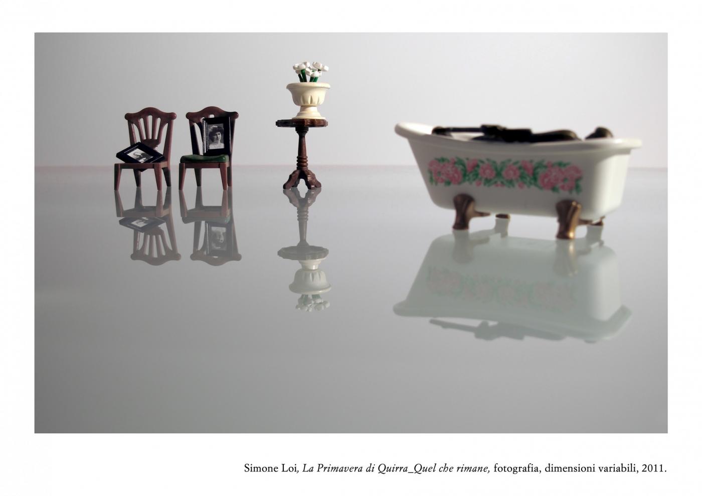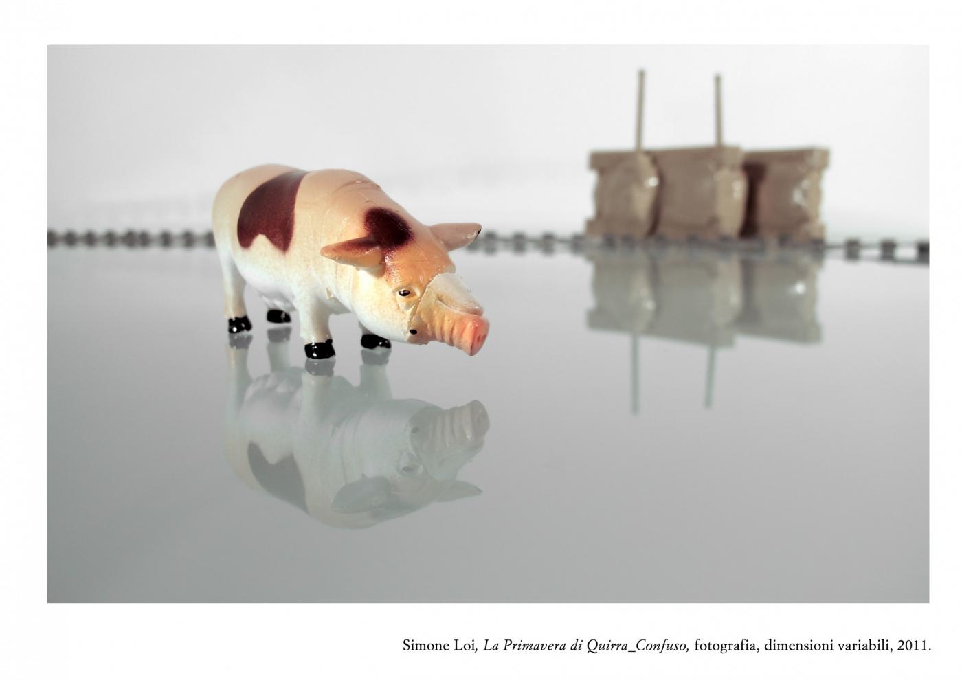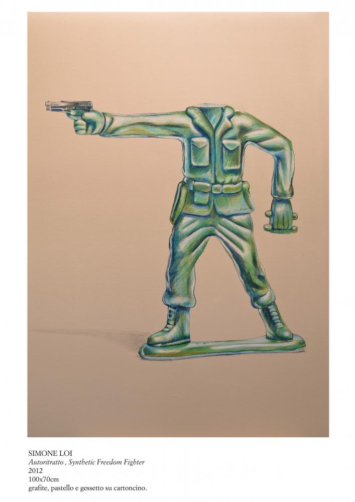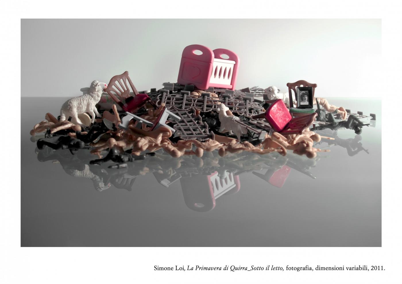Poised between artificial and natural nostalgia, the search continues in the Loi atmosphere of war "Spring Quirra", where soldiers and machines mix and mingle among the highlights of their lifeless forms. A post-war landscape populated by residues of games once again a metaphor for a life lived in ephemeral balance between artifice and reality, is made piece by piece in a dimension without time and space. The pastoral world, the Sardinian, is candidly victim of devastation from afar, but did not give up and resist the usurpation of their lands. Finally, the bucolic images are combined in this game of war in a microcosm where everything is fiction except death, because Quirra every battle is artificial, false and useless training for life, where man is not allowed to choose otherwise.