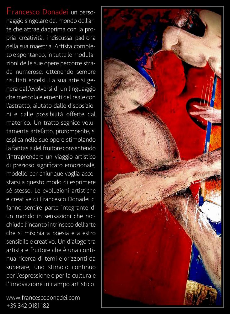 Le opere esposte catturano e affascinano per la capacità di Francesco Donadei di restituire stati d’animo positivi, densi di poesia che invitano all'ascolto interiore ed esteriore. Le sue protagoniste femminili inserite entro scenografie dipinte di luoghi reali e immaginari, incantano e sorprendono in particolare per quella presenza “glamour” che traspare negli atteggiamenti e nelle pose delle figure, regalando le emozioni della vita, proprio come il colore che, con la sua energia, tiene unito ogni elemento del dipinto, esaltandone forma e contenuto.