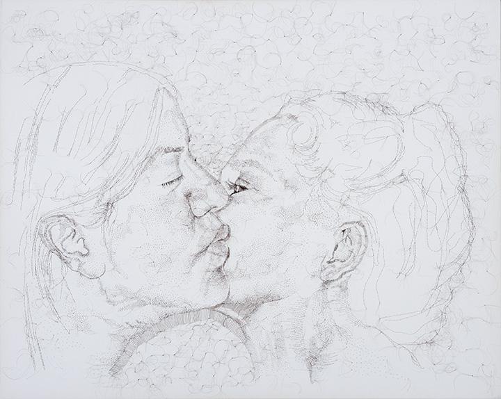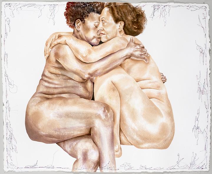 Intimacy in the age of modernity is hampered by gender role expectations and prevailing stereotypes. Kerry Cronin, a guest columnist for the blog New Feminism, posed the questions: what does real intimacy entail and how do I know it when I see it? Her questions are valid -- yet they give rise to more questions. How does real intimacy manifest itself between men? How does a close non-romantic relationship between men differ from the genuine intimacy shared by female friends? Conceptuality of intimacy is shaped by a diversification of visual images populating mass media. I Love You, Man: I Think This is the Beginning of a Beautiful Friendship probes the numerous bromance movies which proliferated movie theaters over the last ten years; the current body of artwork I am creating is my response to the bromance movies. The nature of the bromance movie is to talk about male friendship in a comedic manner; therefore, the term is a preemptive strike against the suggestion of homosexuality. Rosie Franklin in her blog called Disrupting Dinner Parties, Feminism for Everyone, says “…there are no neologisms for female platonic friendship the way there are for male friendship because there is no urgent need to specify ‘no homo’ for female friendships. The word ‘bromance’ exists to specify ‘we’re not gay’.” Male characters in bromance movies play for the big laughs as they guffaw, snicker and feign queasiness at physical or emotional intimacy. Bromance has become a contemporary buzzword which drips with defensive irony. In this culture of irony, the act of sincerity or an honest overture of intimacy is dismissed and lost in the laugh track. In my artworks, I am the main character rendered alongside various women friends. We are engaged in the human activity of intimacy. The familiarity is replayed in simplistic actions yet the nature of intimacy is complex. Some images are seemingly mundane, innocuous acts like two women, two straws and one drink. Other images are larger-than-life intersections of affection like the hug of two nude women. These artworks are not dependent upon a barrage of punchlines like those found in bromance movies but rather they are quiet interludes of intimacy. In a society consumed by social media such as Facebook, Twitter, Instagram and Pinterest, we have numerous connectivity modalities available to us. Connections on the internet are devoid of the one basic need every human craves – real intimacy. Real intimacy involves shared space in real time and an acute awareness of one another. At a time when irony and sarcasm reign and sentimentality is pooh-poohed, I am, in my own hokey way, paying tribute to women in my life who have touched my existence by the warmth of a smile, the touch of a hand, or the brush of a kiss.