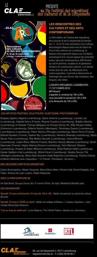 Festivals, Luxembourg, Luxembourg, 11 March 2016 33° Festival of migrations, of cultures and of citizens Added 9 years ago 1 I Like I don't like 1 Comment 91 Visits Share Facebook Twitter Google + Comments 1 9 years ago Tanya Bartolini Premium Artist congratulazione e un grande in bocca al lupo !!!!:D Say something You must login or Sign Up to write a comment Join