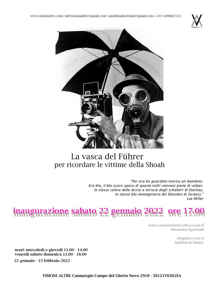Sabato 22 gennaio 2022 alle ore 17.00 in occasione del giorno della memoria nella galleria VISIONI ALTRE viene inaugurato il progetto La vasca del Führer – per ricordare le vittime della Shoah, una collettiva di opere di artisti invitati che saranno esposte fino al 13 febbraio 2022. Il progetto ideato e curato da Adolfina de Stefani con testo e presentazione critica a cura di Alessandra Agostinelli.