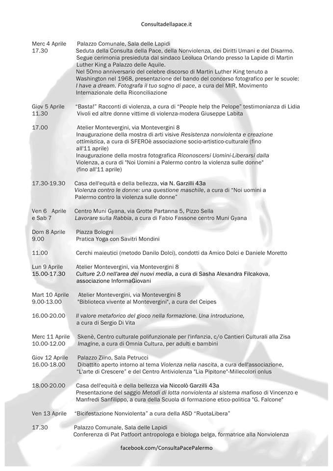 La Cerimonia di apertura della Manifestazione ricca di eventi è presieduta dal Sindaco di Palermo Leoluca Orlando, mercoledì 4 aprile 2018 ore 17, presso la Lapide di Martin Luther King nella Sala delle Lapidi di Palazzo delle Aquile.