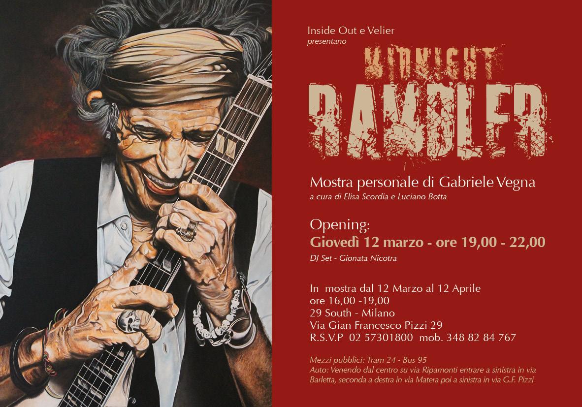 La mostra Midnight Rambler è un itinerario fra arte, design e musica. Un percorso che integra le opere dell’artista Gabriele Vegna con il design originale americano degli anni ’60 e ’70 di Inside Out e 29 South, in un unico progetto. La mostra non vuole essere un viaggio nostalgico attraverso quegli anni, ma una rivisitazione di quelle tendenze culturali che hanno influenzato l’arte, la musica e il costume delle persone in ogni parte del mondo.