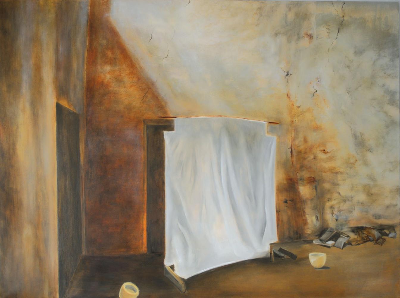 Alessandra Bonomini interpreta il tema della stanza, dello spazio, come un non luogo della parola, dove ciò che si vuole esprimere si "ferma prima"di manifestarsi. Un luogo dove si determina un limite di silenzio, in cui ciò che conta è il confine di uno spazio aperto,lasciato intonso.