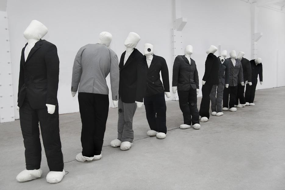 The installation Mumbled (2007-2008) is composed of ten dolls without faces, made in natural size, which are wearing everyday male clothes. The dolls are placed in a regular line. One doll is standing in front of or behind the other. The line is set up as “a line” of a mass or group of people waiting to enter a bus, a museum, a consulting room, court interrogation, a bank, a post office etc. On the other hand, the line is slightly chaotic. Set up of figures, it is, indeed, abstract - it might have been set on every place at every time, being, nevertheless, very concrete – it is set here, placed in front of the spectator in all its presence. The figures emit an indistinguishable speech, a kind of mumbling or a murmur. This sound creates a confusing situation being very familiar and very unclear at the same time, which is hardly part of everyday experience even though resembling it.