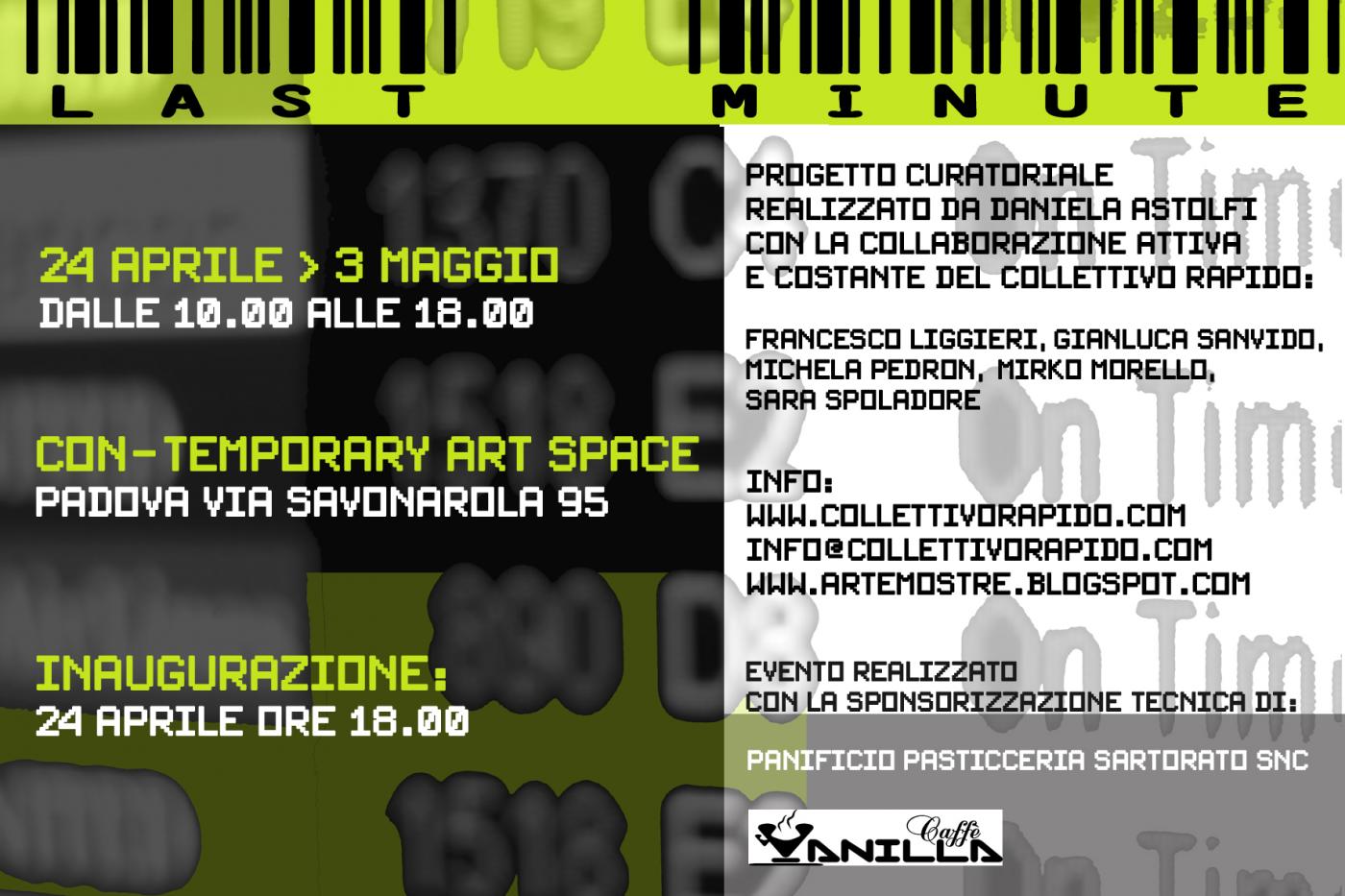 Il progetto curatoriale di Last Minute è realizzato da Daniela Astolfi con la collaborazione attiva e costante del Collettivo Rapido.