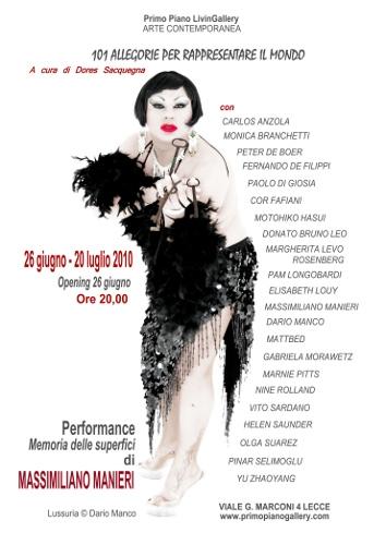 In occasione dell’opening inaugurale la performance dell’artista leccese MASSIMILIANO MANIERI dal titolo ”Memorie delle superfici”. La performance di Manieri - che nella sua lettura più ampia ci ricollega alle parole del filosofo francese Baudrillard nella sua “Illusion de la fin” in relazione alla morte dell’oggetto e al senso di perdita - ne ribalta il concetto, intavolando una piece dove egli stesso rappresenta l’oggetto e il soggetto del desiderio. Natura e artificio, corpo come cibo e pratica di potere e di selezione, valore d’uso e valore di scambio, biodiversità e cultura di massa. Su questi concetti si innesta la ricerca del I atto performativo, sulla dicotomia dell’ “Obbedienza & C-Astrazione”, dell’ uomo-simbolo-simulacro, alienato dalla società industriale. Una provocazione colta sul mutamento dalla qualità alla quantità, sulla strumentazione tecnica dei media.