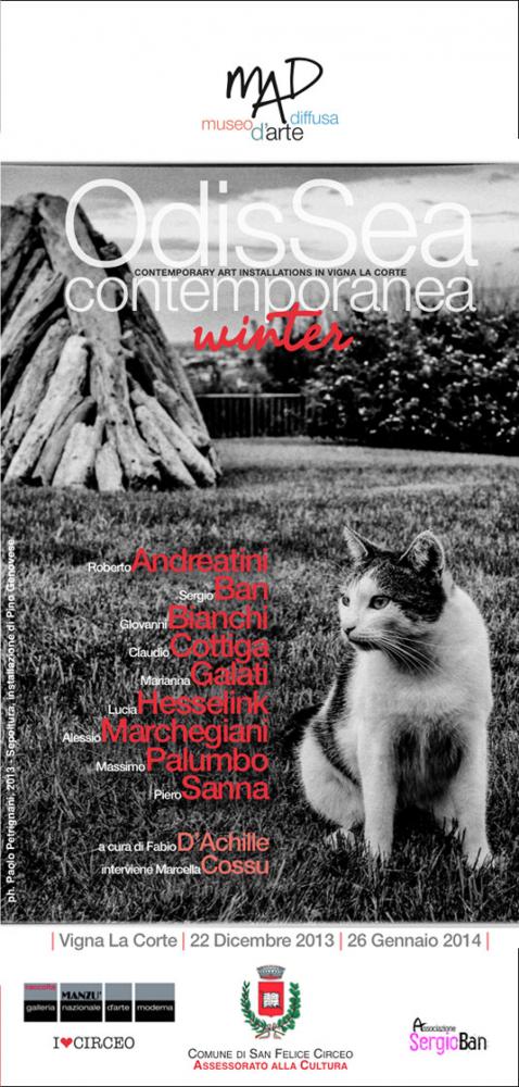 Odissea Contemporanea si è rivelata attraverso l’autunno 2013 un’esperienza profonda e quintessenziale come il mare stesso: gente che va - Lorenzo Indrimi - gente che torna – Piero Sanna con i suoi nuovissimi totem in noce e resina, concentrati di luce rappresa-per poi, a sorpresa, tornare ancora a vivere per il tramite di chi ci vuol bene – Sergio Ban - o trasferirsi di poco in linea d’aria-Alberto Timossi, dal Circeo alla Raccolta Manzù - assecondando il ritmo primordiale dell’onda sulla battigia del Lazio pontino, con tanti protagonisti, artisti, curatori, critici, pubblico, in quell’azzurrità assoluta-assolata tra oro e verde del panorama circeo, stringendosi alla figura di quel “Sandokan” o “Passator Cortese” che corrisponde ai tratti di Fabio D’Achille, libero di una libertà contagiosa e vitale.