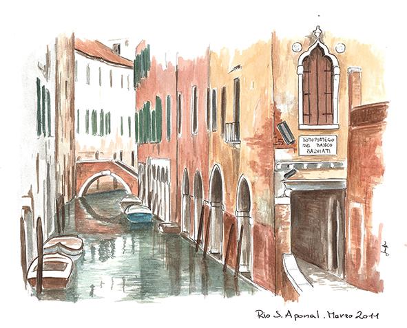 “Venezia, storie d’acqua”, è tratta dall’omonimo libro di Giancarlo De Petris, edito nel 2014 dalla casa editrice El Squero, dove sono presenti una serie di sketchcrawl realizzati negli ultimi quattro anni con soggetti caratteristici di Venezia (monumenti, persone, paesaggi) e brevi testi scritti dall’artista per descrivere storicamente quanto raffigurato.