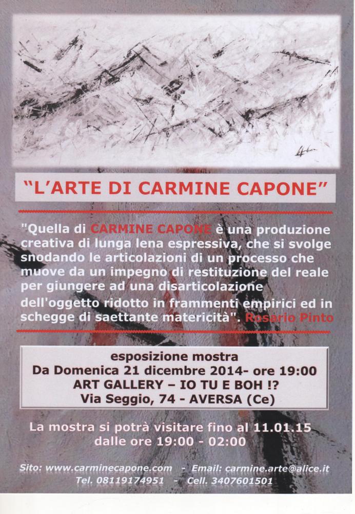 "Quella di Carmine Capone è una produzione creativa di lunga lena espressiva, che si svolge snodando le articolazioni di un processo che muove da un impegno di restituzione del reale per giungere ad una disarticolazione dell'oggetto ridotto in frammenti empirici ed in schegge di saetttante matericità". Rosario Pinto