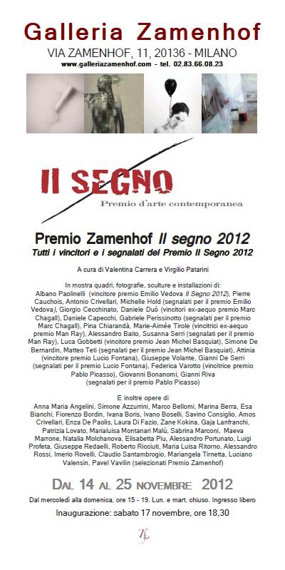 Albano Paolinelli (vincitore premio Emilio Vedova, “Il Segno 2012”), Pierre Cauchois, Antonio Crivellari,Michelle Hold (segnalati per il premio Emilio Vedova), Giorgio Cecchinato, Daniele Duò (vincitori ex-aequo premio Marc Chagall), Daniele Capecchi, Gabriele Perissinotto (segnalati per il premio Marc Chagall), Pina Chiarandà, Marie-Aimée Tirole (vincitrici ex-aequo premio Man Ray), Alessandro Baito, Susanna Serri (segnalati per il premio Man Ray), Luca Gobbetti (vincitore premio Jean Michel Basquiat), De Bernardin Simone, Matteo Teti (segnalati per il premio Jean Michel Basquiat), Attinia (vincitore premio Lucio Fontana), Volante Giuseppe, De Serri Gianni (segnalati per il premio Lucio Fontana), Federica Varotto (vincitrice premio Pablo Picasso), Bonanomi Giovanni, Riva Gianni (segnalati per il premio Pablo Picasso)