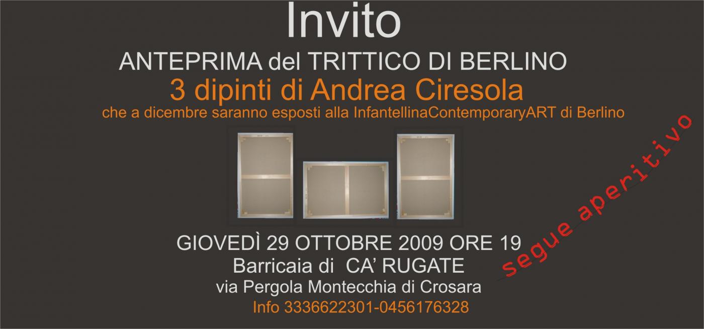 E' l'occasione per vedere in Italia le tre opere che verranno esposte nei mesi di dicembre e di gennaio p.v. a Berlino presso la Infantellina Contemporary Art. L'invito a partecipare è esteso a tutti... anche per degustare un buon bicchiere di vino offerto dalla casa vinicola Ca' Rugate.