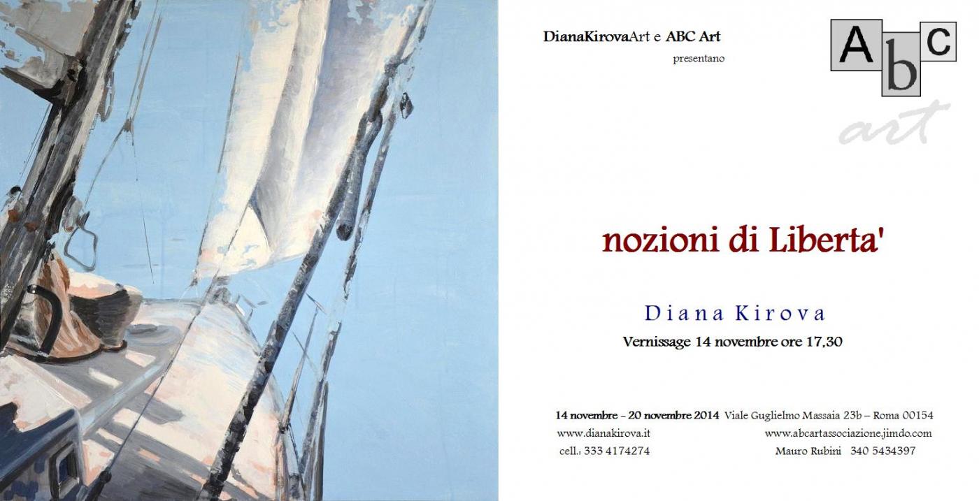 Venerdì 14 novembre 2014 dalle ore 17,30 alle ore 20,00 si inaugura presso ABC art Gallery, Roma, la mostra personale di Diana Kirova “Nozioni di Libertà”. La mostra rimarrà aperta fino al 20 novembre 2014 ed è a cura di Mauro Rubini.