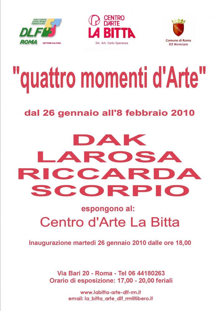 Quattro Artisti che condividono lo spazio associativo per questa Mostra Personale al Centro d'Arte "La Bitta" dal 26 genn. fino a 08 febbraio 2010 in via Bari,20 - Roma.